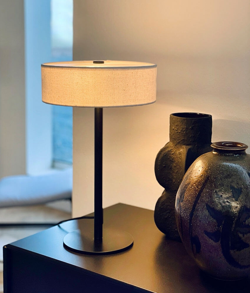 Dyberg Larsen Calix tafellamp in zwart met natuurkleurige ronde stoffen kap
