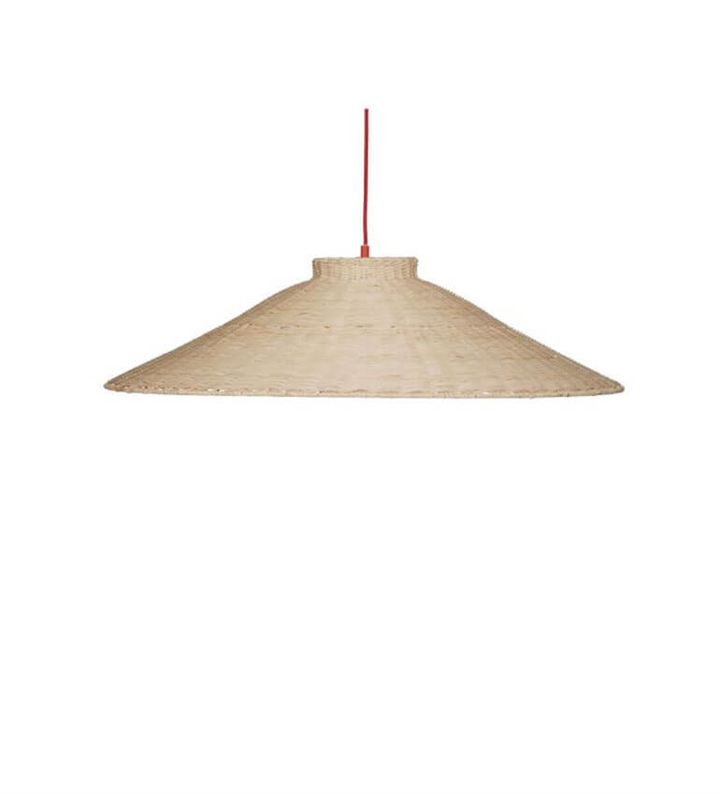 Deze prachtige hanglamp geeft een zeer natuurlijke en rustige uitstraling, maar de rode kabel geeft de lamp een frisse touch. Het licht is zeer aangenaam dankzij de gevlochten structuur van de kap. De hanglamp heeft een mooie trapeziumvorm, die een breed lichtspectrum biedt, zowel mooi boven de salontafel als geschikt voor de slaapkamer.