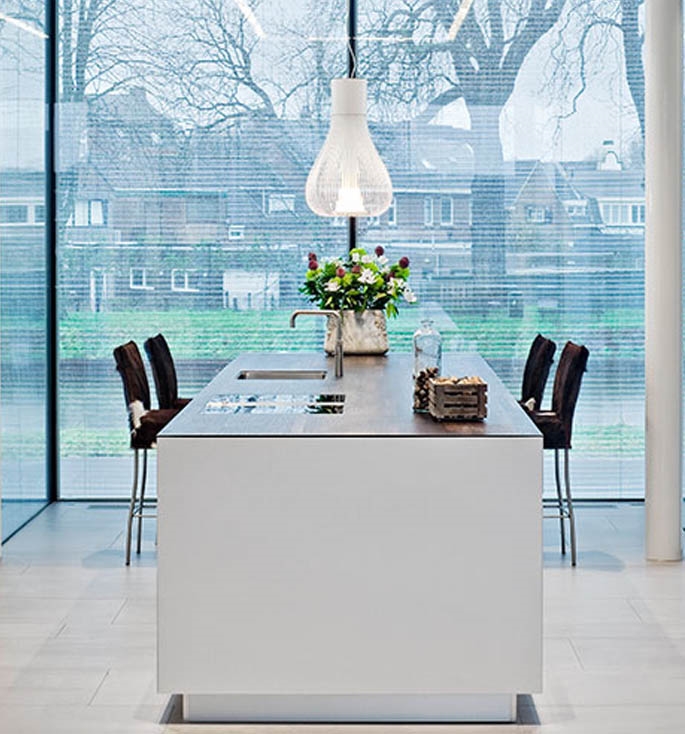 De hanglamp heeft een flexibele vorm en is elegant in zijn uitstraling. Verkrijgbaar in zwart en wit.