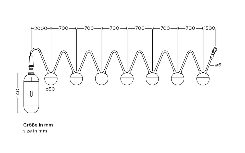 De lichtslinger heeft een totale lengte van 7,84 m en is ontworpen voor buitengebruik. Hang hem in een boom in de tuin of gebruik hem als terraslamp of eventueel boven de tuintafel door de slinger op te tillen met twee stokken, die apart verkrijgbaar zijn als Cherry Bubbls Canes en eenvoudig op de tafel kunnen worden gemonteerd.