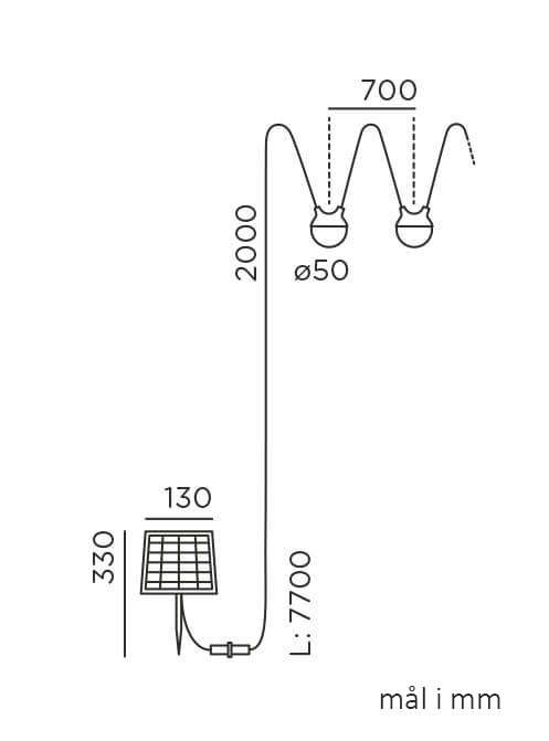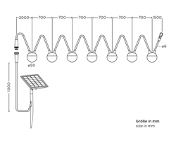 Afmetingen: Lichtslinger: L7,70 m, kappen: Ø5 cm, zonnepaneel: H33 x B13 cm