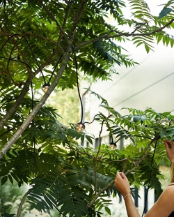 Cherry Bubbls Solar is een LED-lichtslinger die ideaal is om sfeer en ambiance buiten te creëren. De slinger bestaat uit zeven pendels met rookglas en een afstand van 70 cm tussen elk. Het meegeleverde zonnepaneel laadt de batterij op bij daglicht en schakelt de lichtslinger automatisch in bij schemering en uit na vijf uur. De lichtslinger heeft een totale lengte van 7,70 m en is ontworpen voor buiten gebruik. Hang het in een boom in de tuin of gebruik het als terrasselamp.