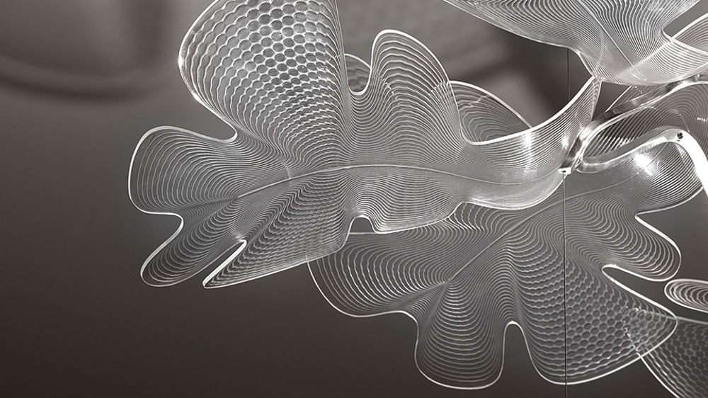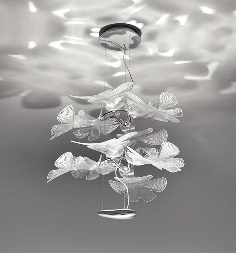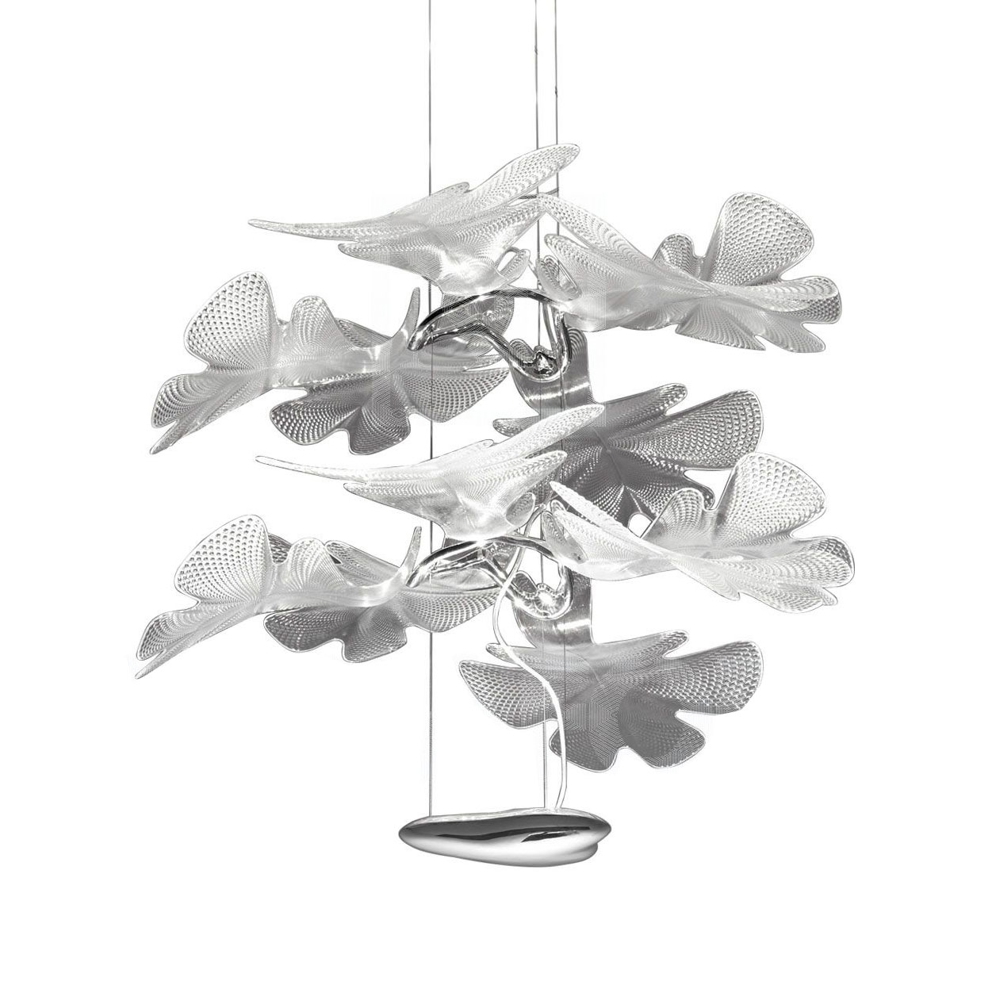 Mooie hanglamp met een frame van aluminium en bladeren van transparant plastic. De hanglamp benadrukt zowel Artemide als Ross Lovegroves ongelooflijke vermogen om verlichting te ontwerpen die vernieuwend en organisch van vorm is.