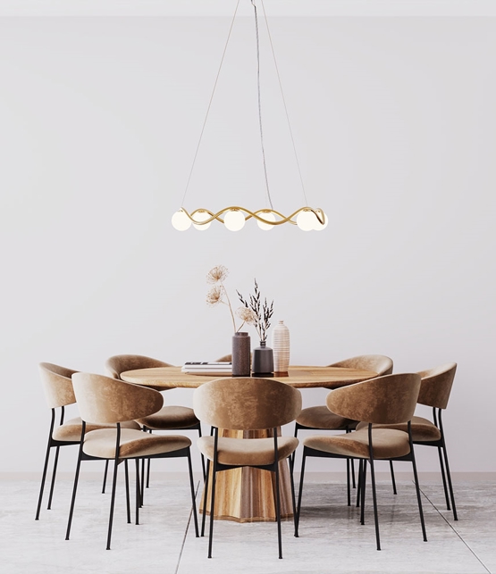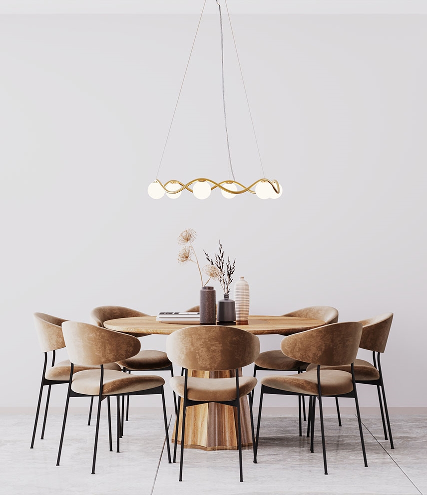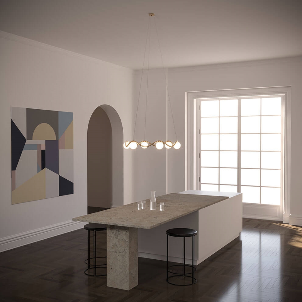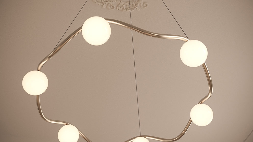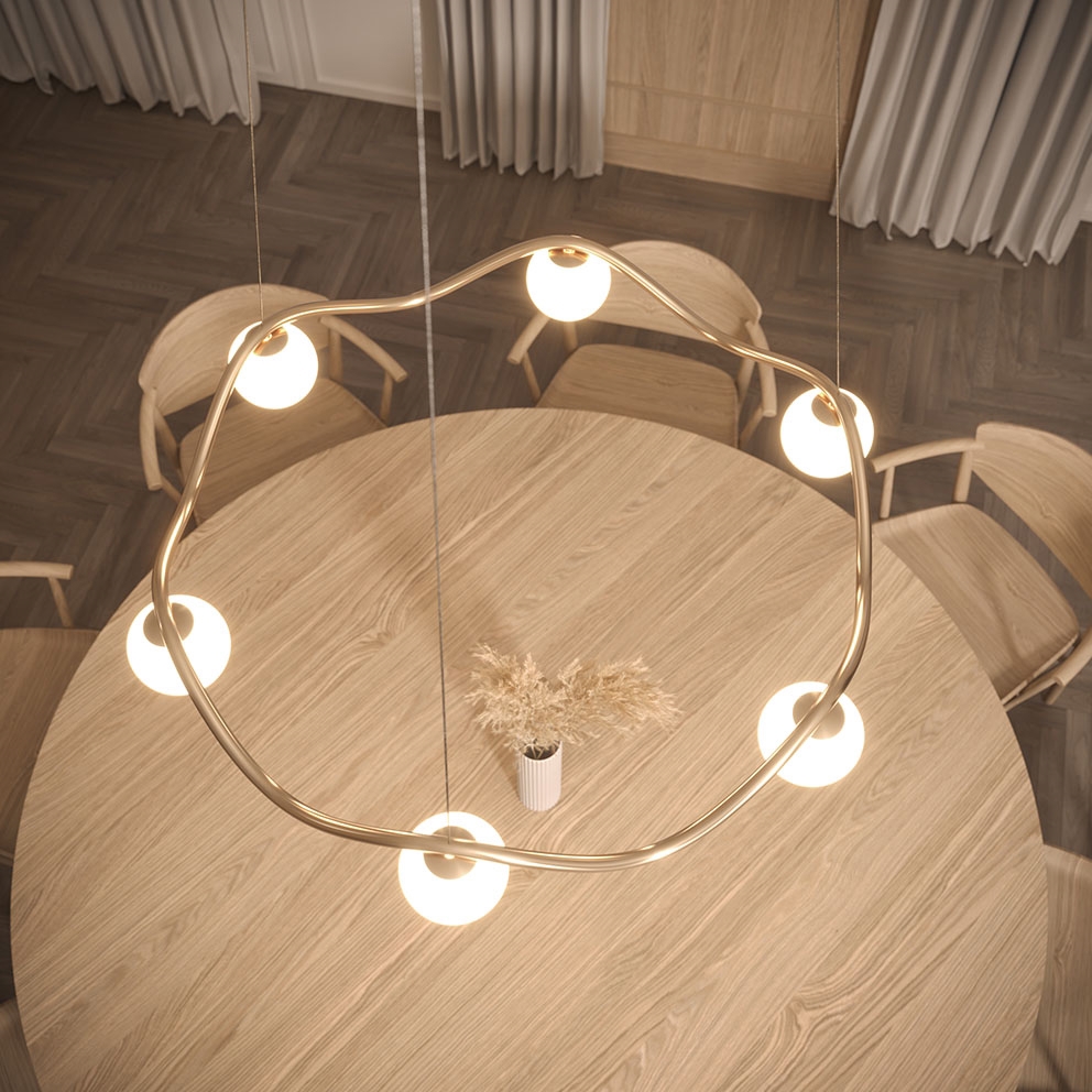 De kroonluchter Circle of Life is verfijnde Scandinavische minimalisme met een elegant uiterlijk geïnspireerd door de ups en downs van het leven. Het sculpturale frame in handgemaakt gepolijst messing heeft organische rondingen en zes mondgeblazen bolvormige kappen in opaalglas. De grote kroonluchter verspreidt een zacht licht en is ideaal als verlichting boven de eettafel of als middelpunt in de woonkamer, keuken of hal.