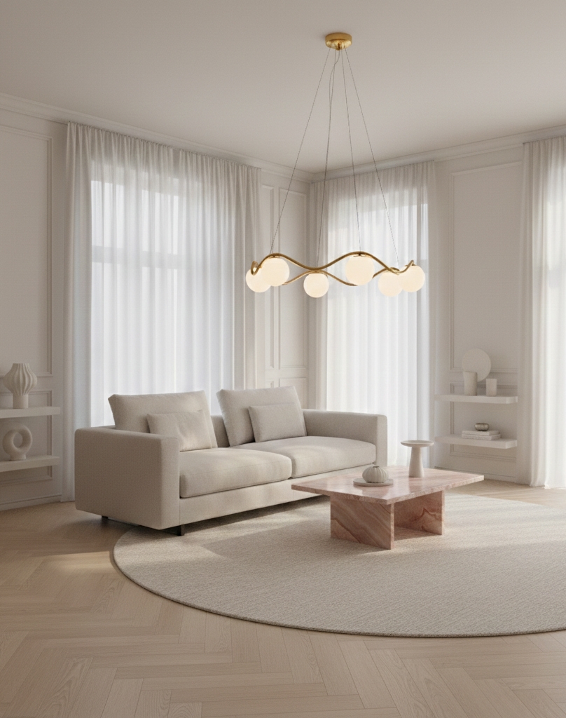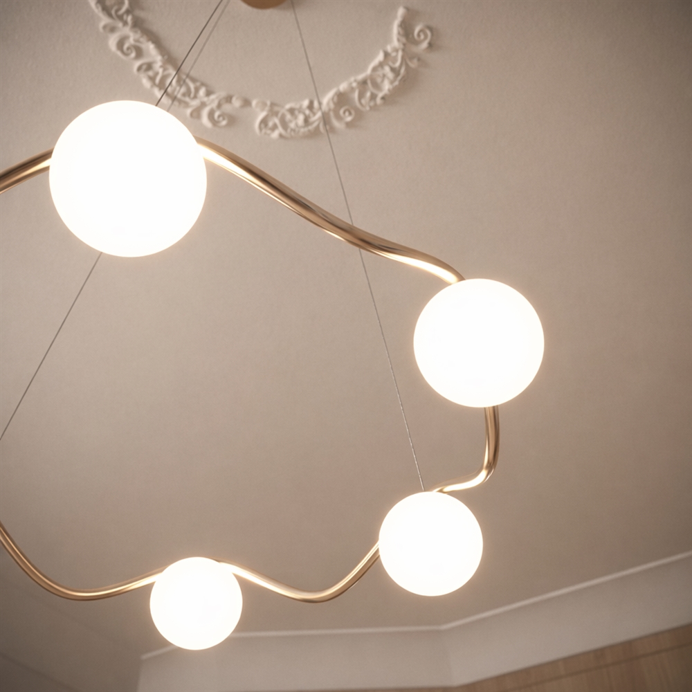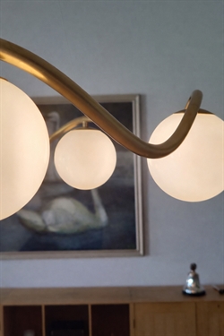 De kroonluchter Circle of Life is verfijnd Scandinavisch minimalisme met een elegante uitstraling, geïnspireerd door de ups en downs van het leven. Het sculpturale frame van handgemaakt gepolijst messing heeft organische rondingen en zes mondgeblazen bolkappen van opaalglas. De grote kroonluchter verspreidt een zacht licht en komt prachtig tot zijn recht als verlichting boven de eettafel of als middelpunt in de woonkamer, keuken of hal.