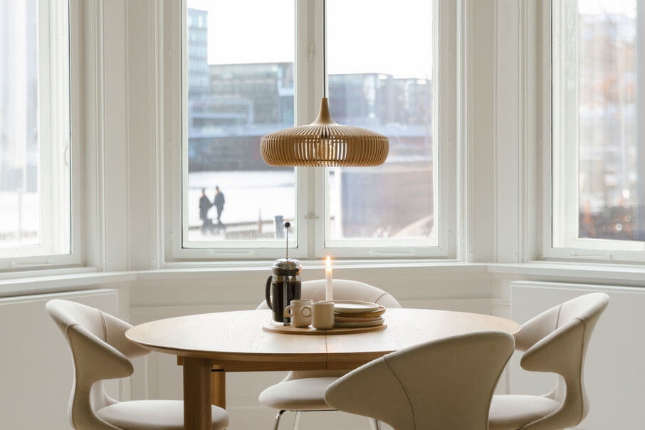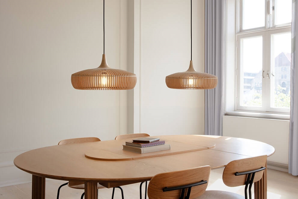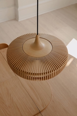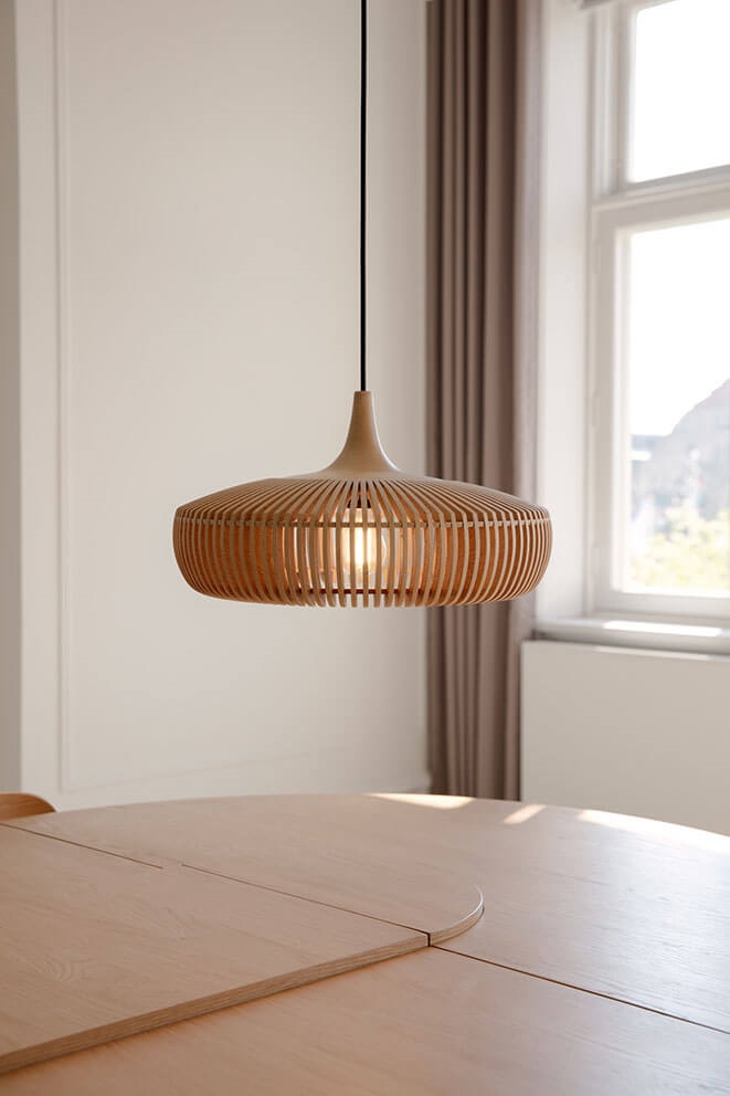 Clava Dine Wood is een lampenkap die prachtige lichtstralen creëert met de lasersnijde houten lamellen die rondom de kap zijn geplaatst. Het elegante ontwerp met de eenvoudige lijnen en een top van massief eiken maakt de lampenkap geschikt voor veel soorten interieurs. Gebruik de kap bijvoorbeeld als een sculpturale hanglamp boven de eettafel of als verfijnde verlichting in de slaapkamer - en laat een lamp van hout deel uitmaken van je interieur.