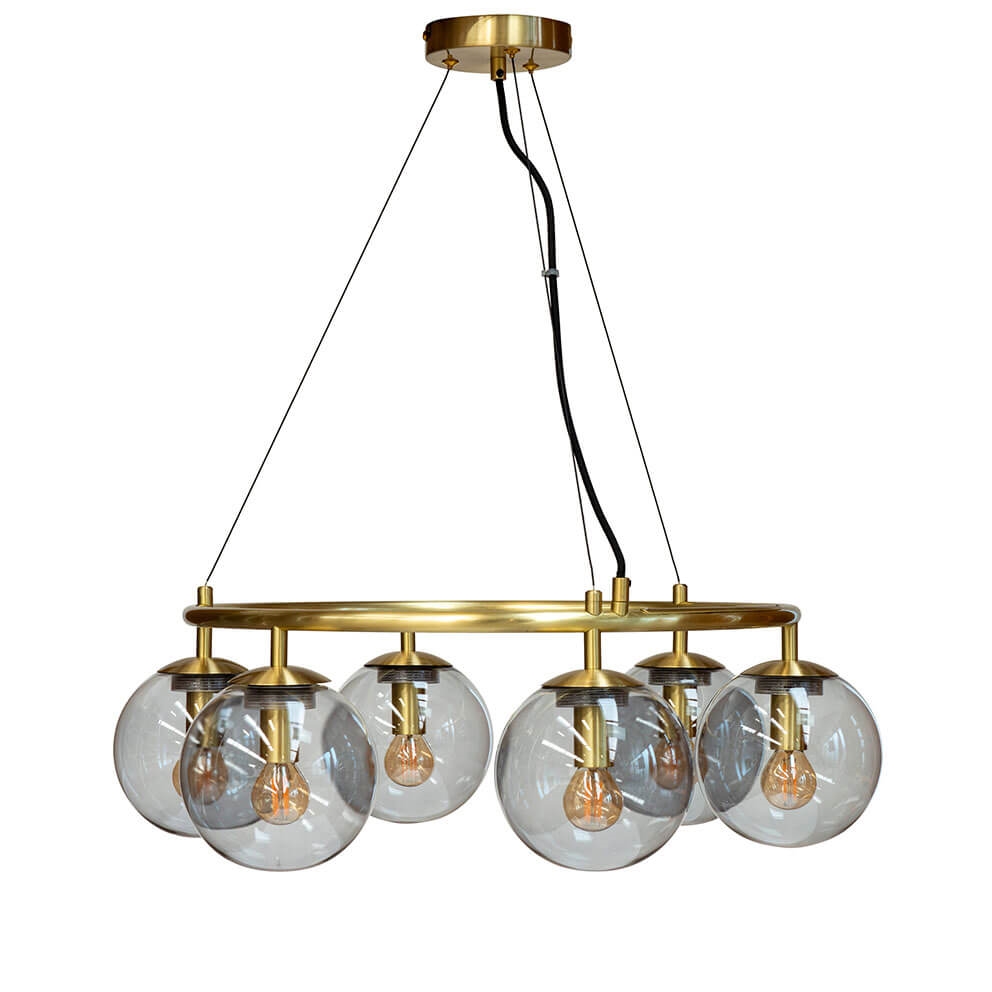 Como de kroonluchter met zes glazen bollen in de kleur smoke en een ontwerp in messing is ideaal als verlichting boven de eettafel. De kroonluchter geeft een aangenaam licht en is tegelijkertijd met zijn ontwerp een opvallend element in je interieur. De lamp hangt aan de meegeleverde rozet in messing met drie draden en heeft een stijlvolle en elegante uitstraling.