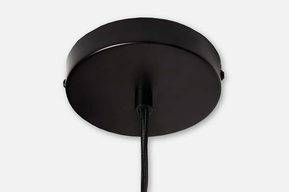 De buitenkant van de lampenkappen is van zwart geschilderd metaal en de binnenkant van lichtgrijs geschilderd metaal.