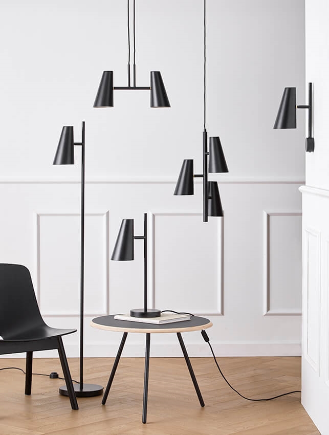 De Cono-serie is ook verkrijgbaar als wandlamp, vloerlamp, tafellamp en als hanglamp met twee kappen.
