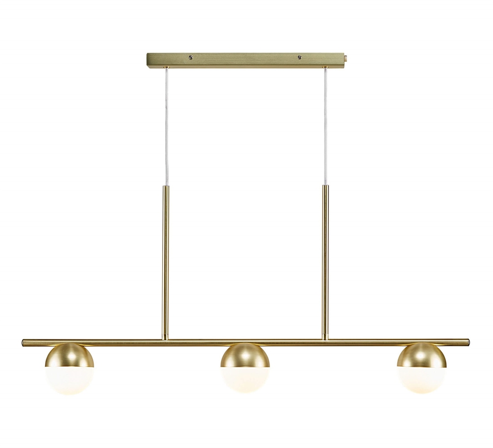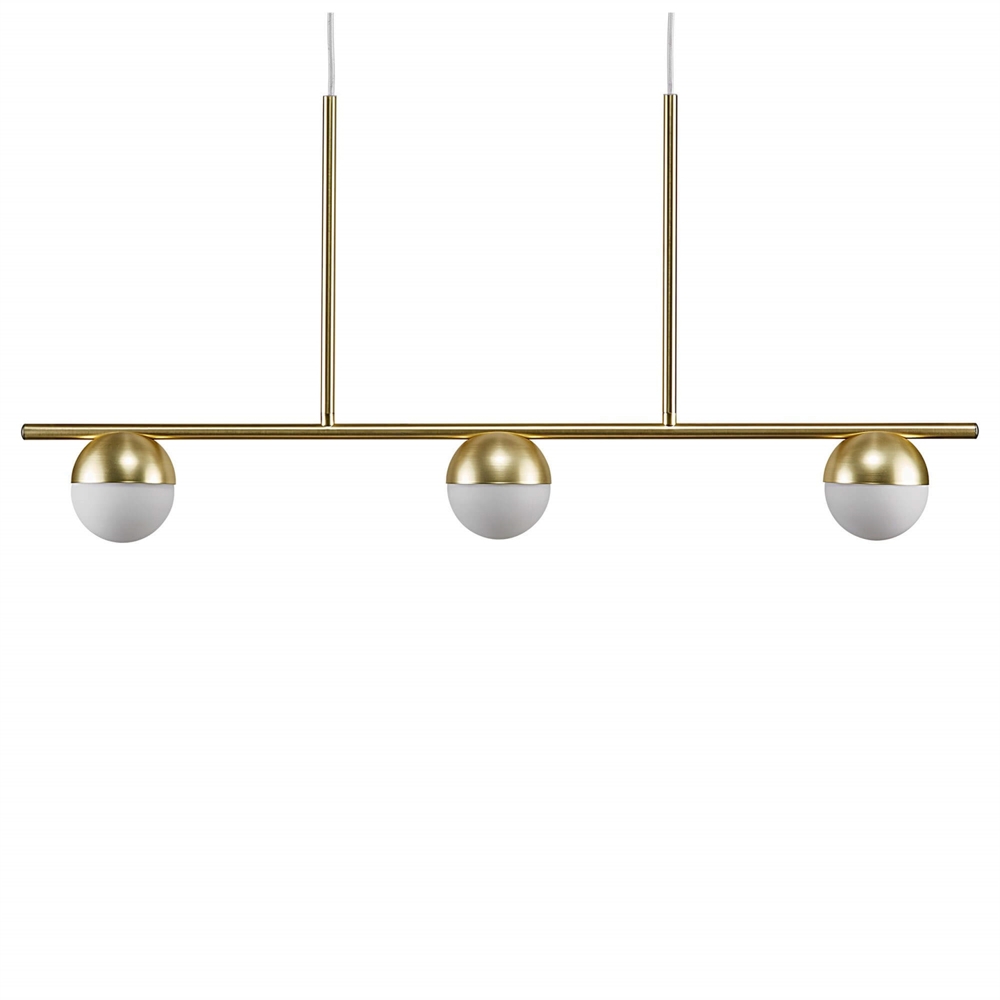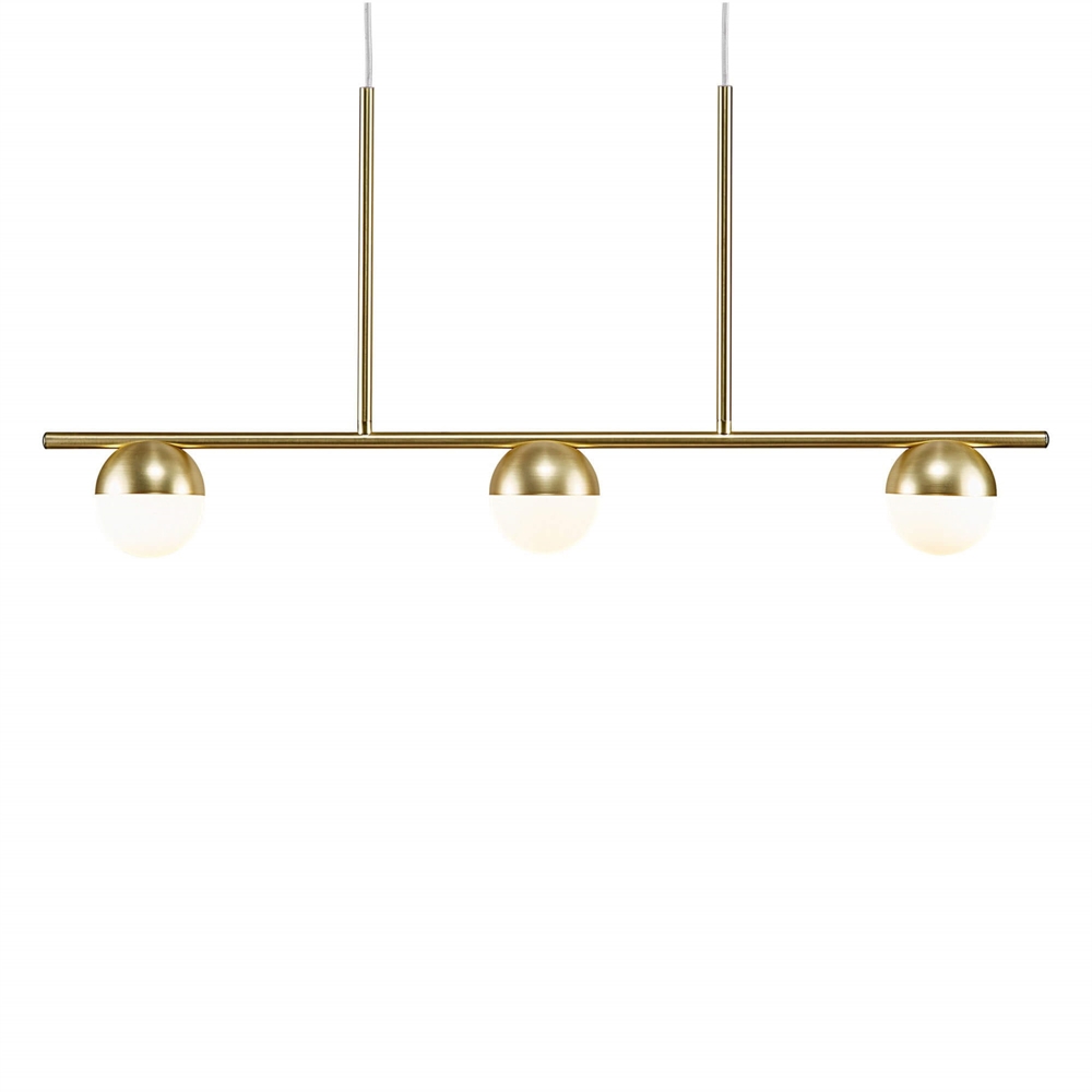 De langwerpige hanglamp Contina 3-Spot heeft een slank ontwerp met een zacht en aangenaam licht en is perfect boven de lange eet- of keukentafel. De bolvormige matte opaalwitte glazen kappen geven de hanglamp een elegante uitstraling in moderne art deco-stijl. Elke glazen kap is mondgeblazen, waardoor er luchtbellen in het glas kunnen voorkomen en de dikte kan variëren. Deze productie geeft het glas karakter en een levendige uitstraling.