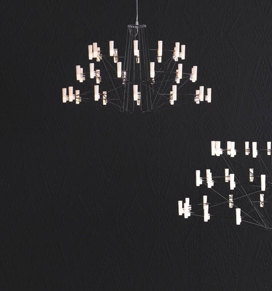 Deze unieke kroonluchter is geïnspireerd op het bekende Coppélia-ballet. De lieve en delicate dansbewegingen van de ballerina wilde Miyake vooral tot leven brengen met de Coppélia kroonluchter.