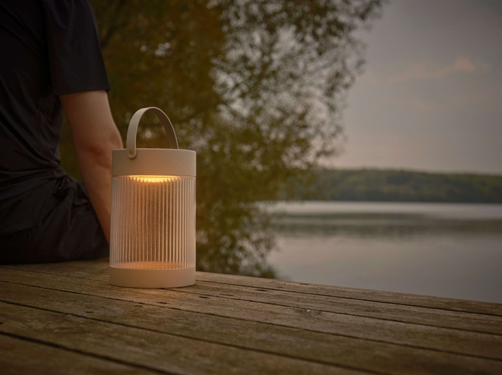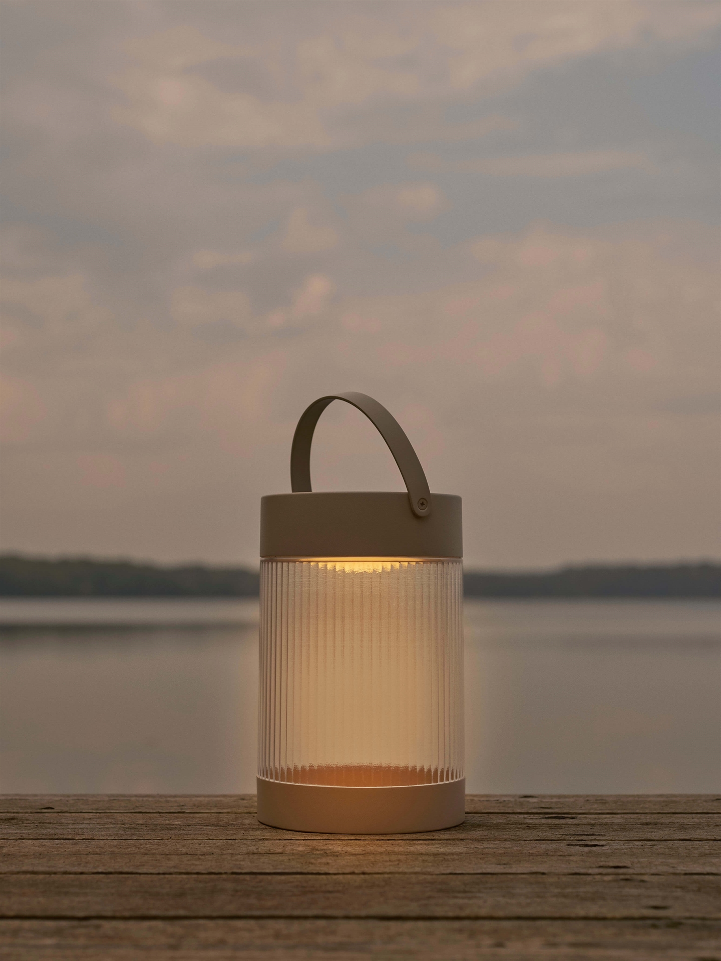 De draagbare tafellamp Coupar Solar is Deens design met een geribbelde kap die zorgt voor een aangenaam licht.