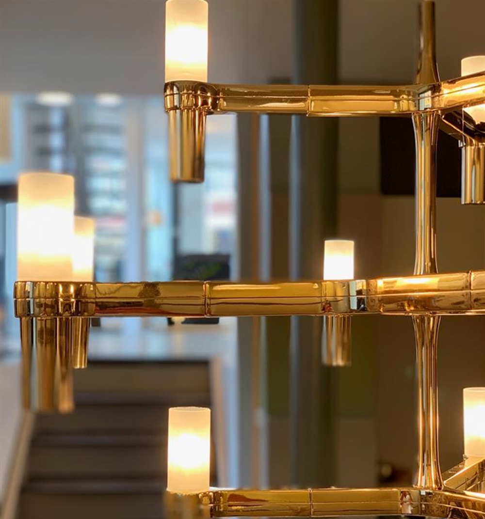 De Crown Minor hanglamp is een prachtige lamp gemaakt van verschoven aluminium armen met gezandstraalde glazen kappen, en is verkrijgbaar in de kleuren chroom, glanzend goud, mat goud, mat zwart en mat wit.