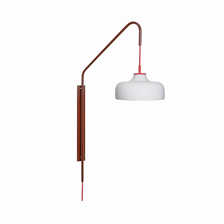 De Current wandlamp bestaat uit een rood/bruine basis en een witte opale kap gemaakt van glas. De wandlamp past op veel plekken in het interieur en kan eenvoudig worden opgehangen in de hal, keuken, woonkamer of slaapkamer.