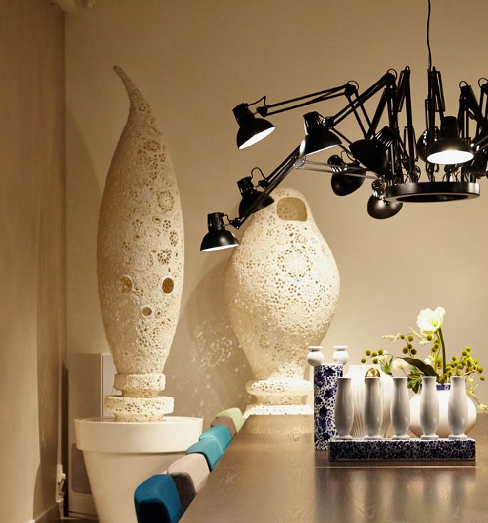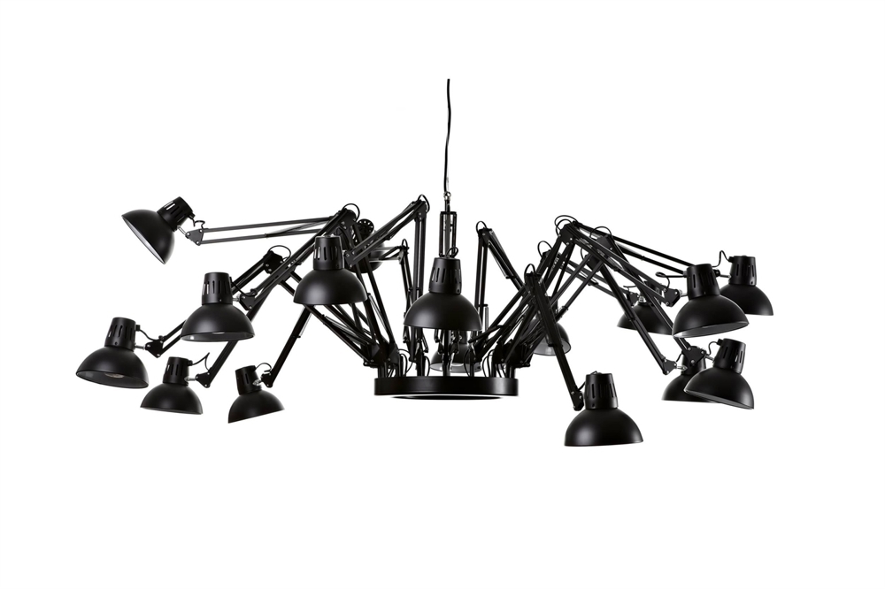 De hanglamp bestaat uit 16 architectlampen gemonteerd op hetzelfde armatuur - en wordt op deze manier een moderne variant van de klassieke kroonluchter - met de uitstraling van een spin.