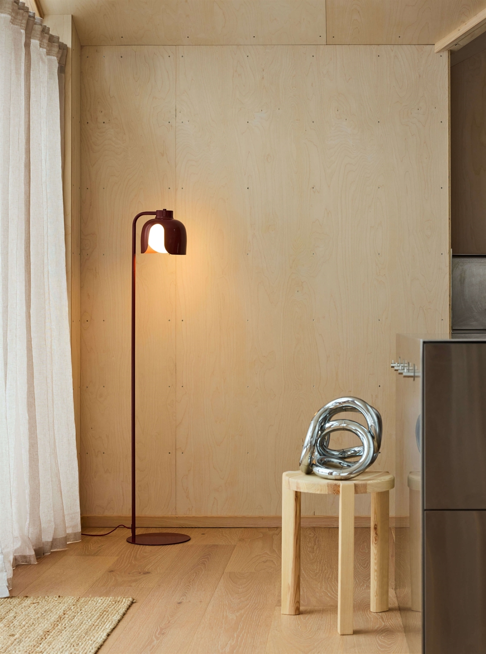 De vloerlamp is verkrijgbaar in meerdere kleuren met bijpassend stoffen snoer.