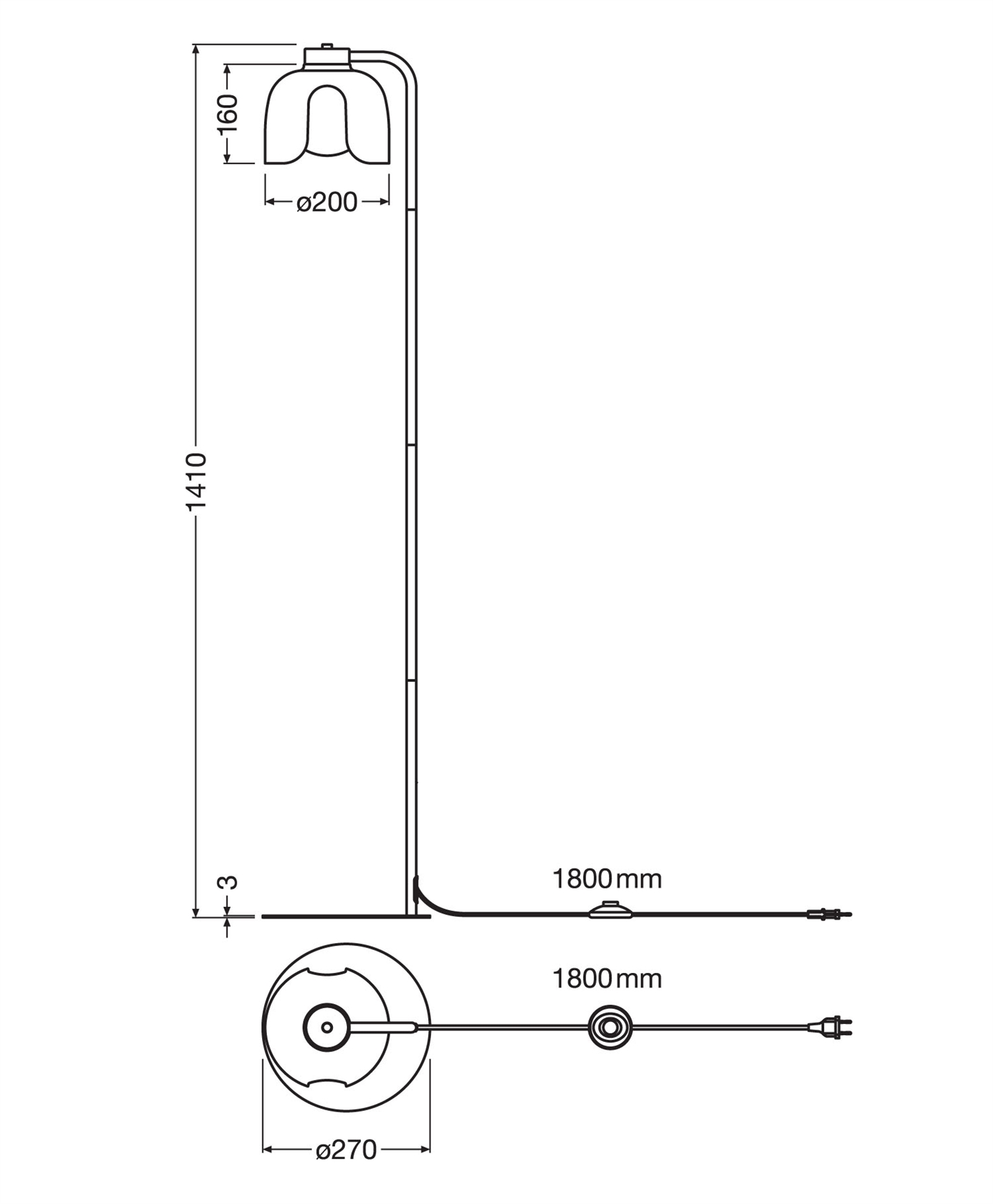 Maten: H141 cm, voet: Ø27 cm, kap: Ø20 x H16 cm