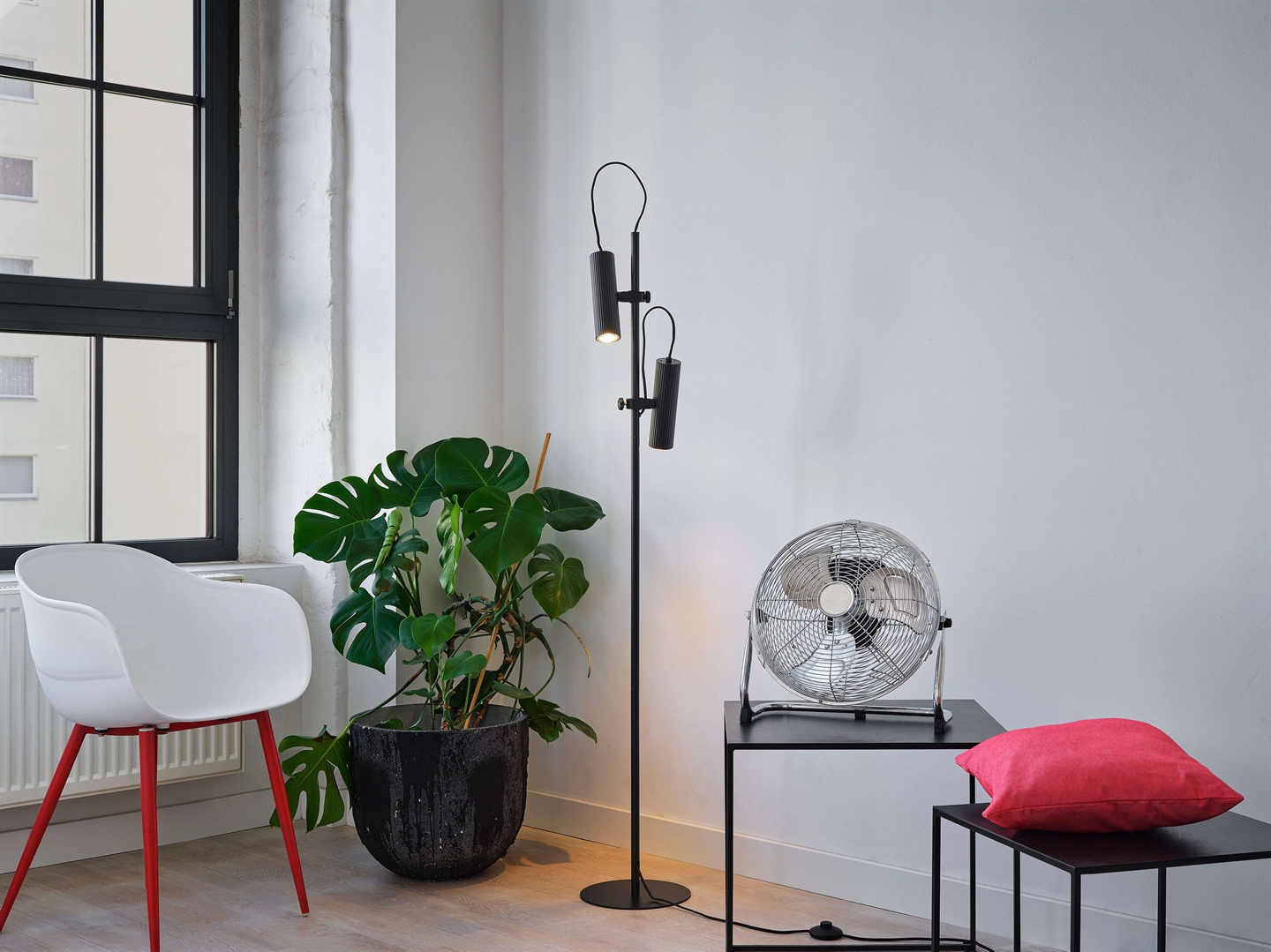 De vloerlamp Decor Drums in staal met een matzwarte afwerking heeft een minimalistisch ontwerp dat perfect in veel interieurs past. De geribbelde kappen zijn een subtiel detail dat de lamp een verfijnde uitstraling geeft. De lichtinval kan met de twee kappen worden aangepast, waardoor de lamp een uitstekende keuze is als leeslamp bij de fauteuil of sfeerverlichting in de woonkamer.