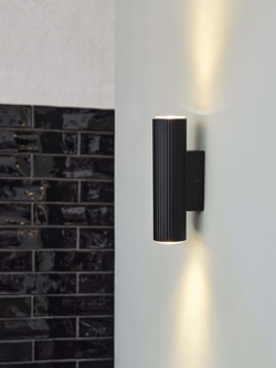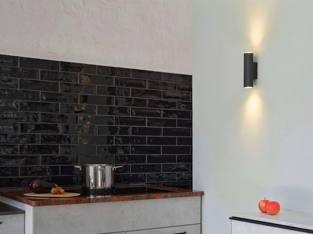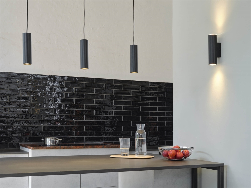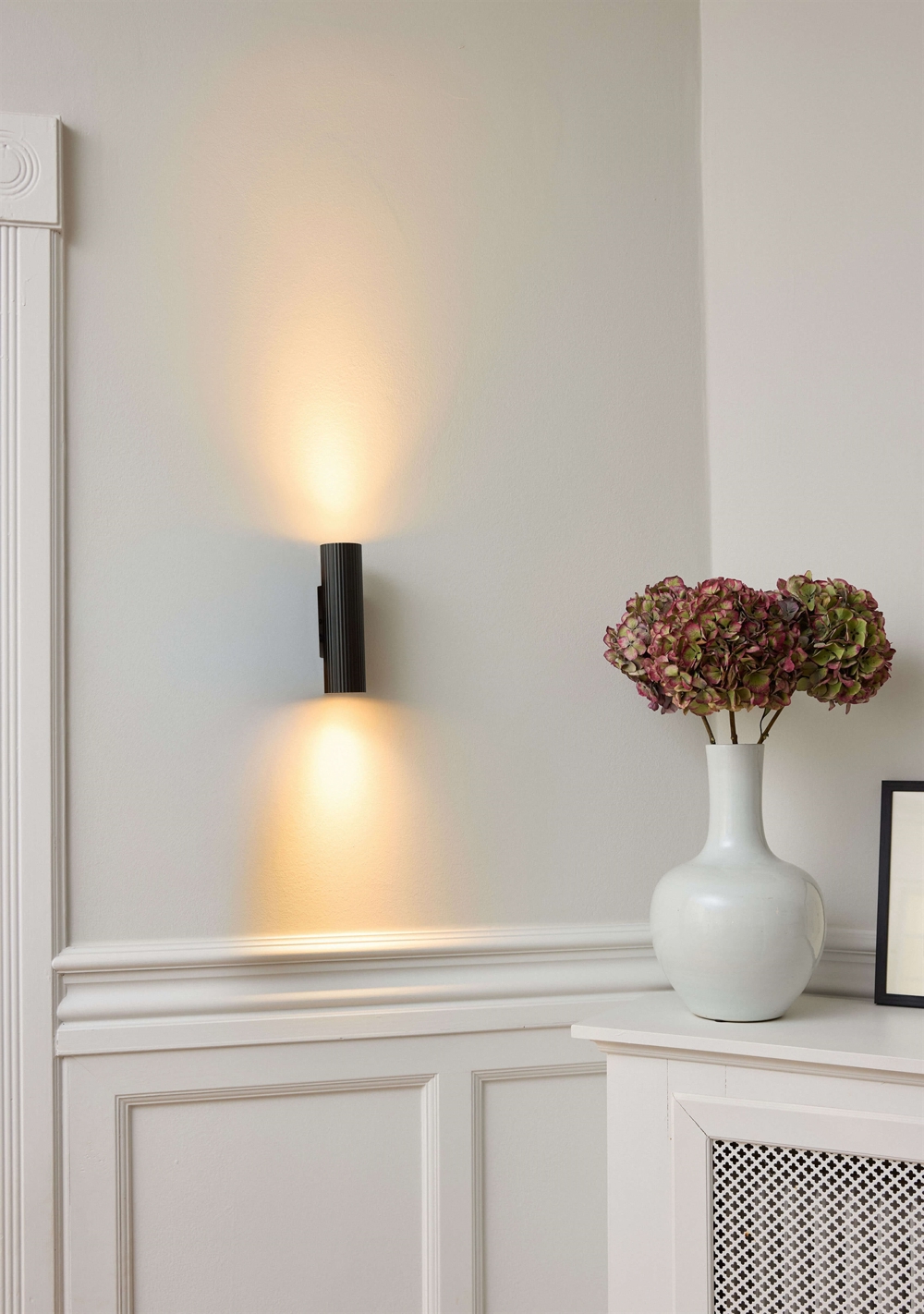 De wandlamp Decor Drums in staal met een matzwarte afwerking heeft een minimalistisch ontwerp dat perfect in veel interieurs past. De geribbelde kappen zijn een subtiel detail dat de lamp een verfijnde uitstraling geeft.