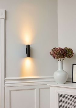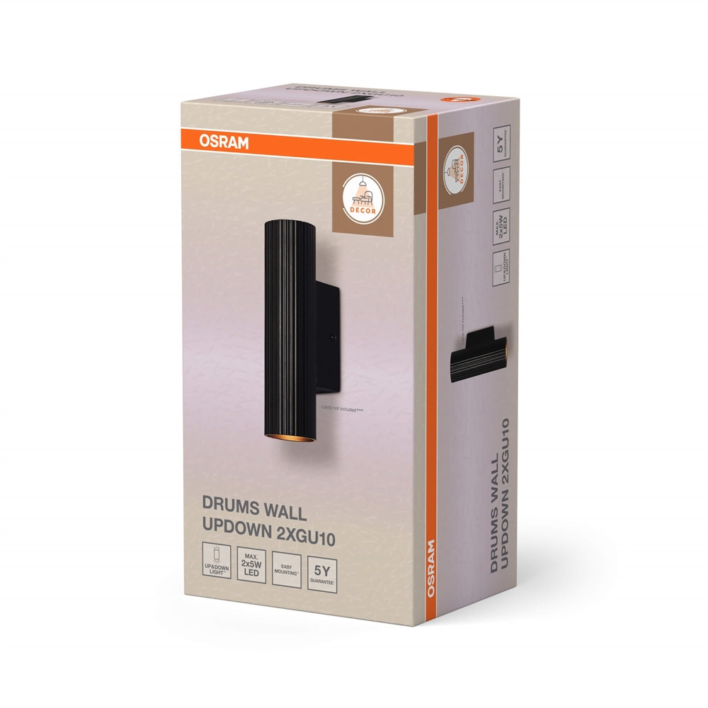 De wandlamp richt het licht zowel naar boven als naar beneden en kan goed worden gecombineerd met andere lampen in de Decor Drums-serie om een geheel in het interieur te creëren. Hij moet hardwired direct op de lampaansluiting worden gemonteerd.