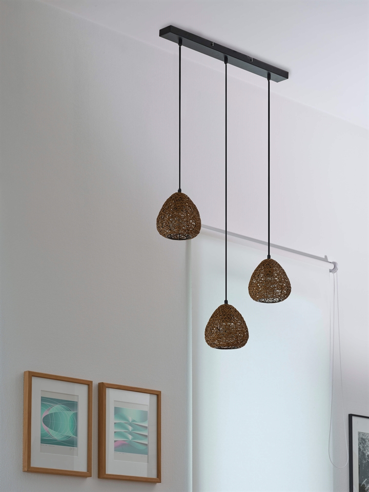De clusterlamp Decor Paper Drop Linear voegt een lichte en sfeervolle elegantie toe aan de ruimte met zijn natuurlijke materialen en zachte vormen. De drie lampenkappen hangen mooi op een rij en zijn gemaakt van dun papier in een warme beige tint, die het licht op een aangename manier filtert en een uitnodigende sfeer in de ruimte creëert.
