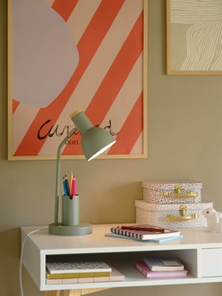 De tafellamp Devone met ingebouwde opbergruimte voor pennen of houder voor een telefoon is de perfecte bureaulamp voor de kinderkamer. Met een coole mix van metaal en FSC-gecertificeerd hout heeft Devone een prachtig ontwerp met een flexibel lampenkapje dat 150° kan kantelen en 320° kan draaien. Functionele en praktische lamp voor het bureau met goed leeslicht en slimme details.