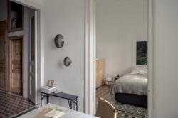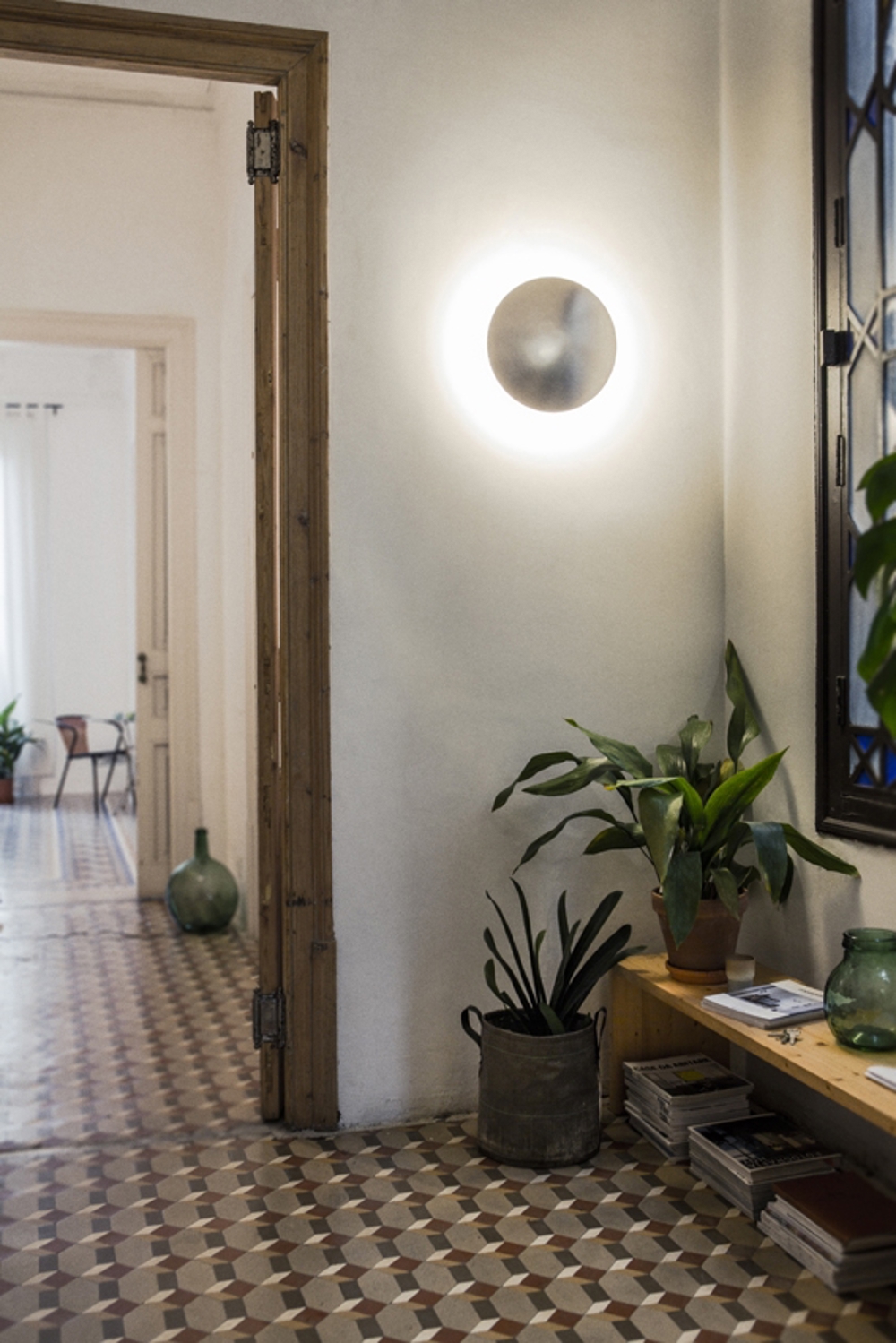 De lamp is ontworpen in nikkel satijn dat in de meeste interieurs past. Wanneer de lamp wordt ingeschakeld, reflecteert deze een warme gloed rondom de schaduw, wat mooie lichteffecten geeft aan hoeken en gangen.