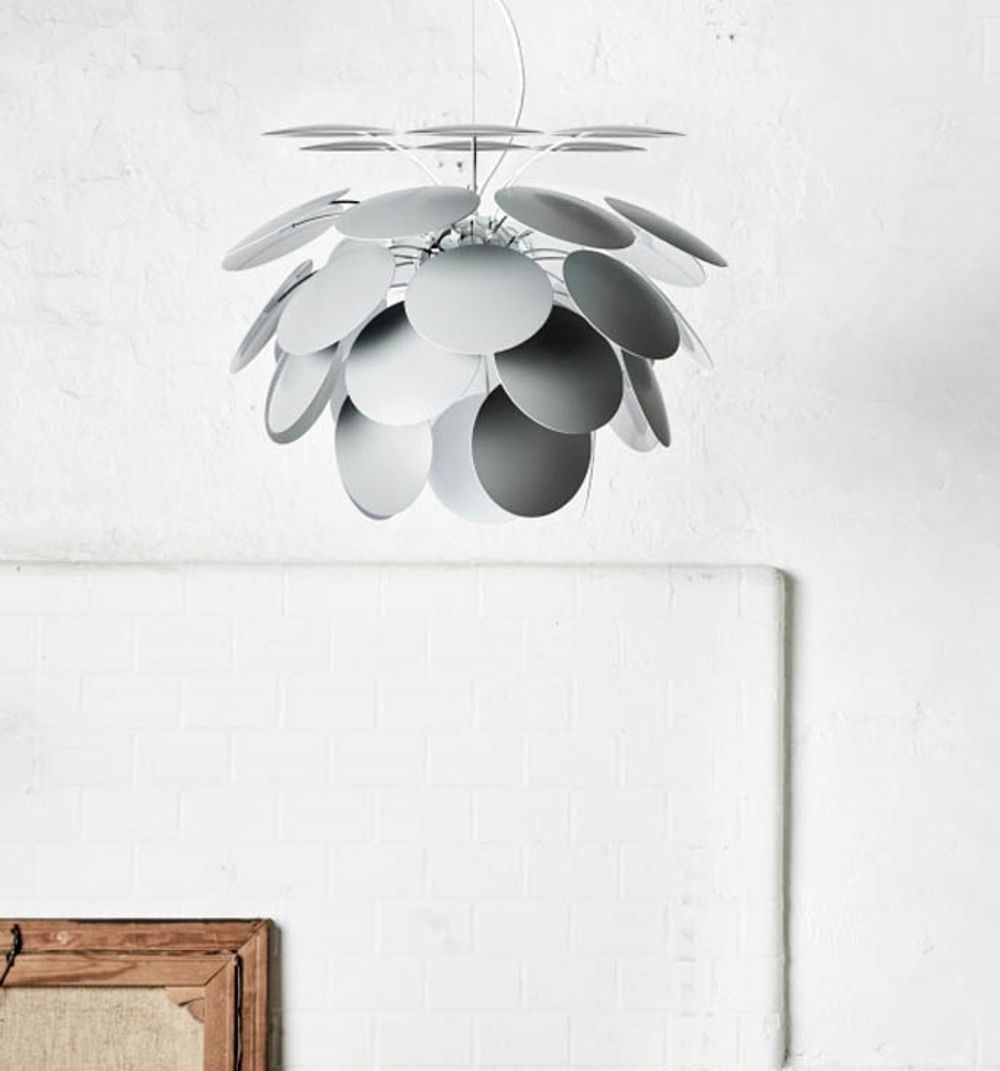 De lamp is samengesteld uit 35 cirkelschijven van ABS-plastic, wat de lamp zijn lichte en fijne uitstraling geeft.