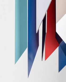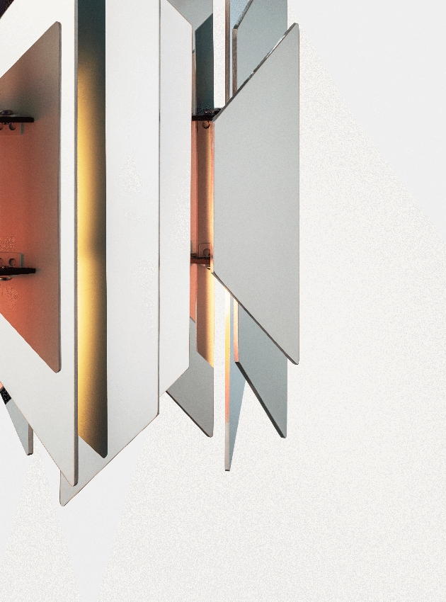 Het bijzondere aan de lamp is zijn vermogen om een prachtig kleurrijk samenspel van licht te creëren, dat ontstaat wanneer het licht de trapezoïden raakt, die in verschillende kleuren zijn gelakt.