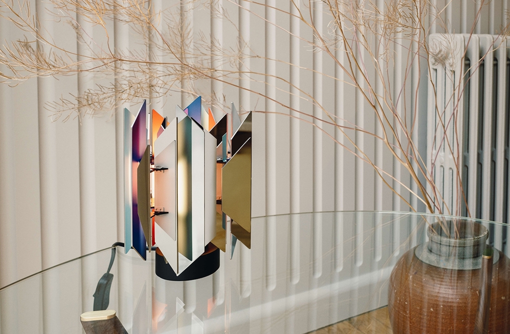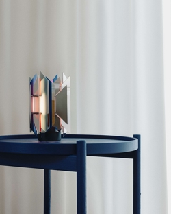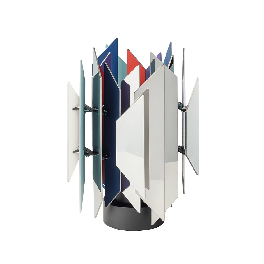 Het bijzondere aan de tafellamp is zijn vermogen om een prachtige kleurrijke lichtsamenwerking te creëren, die ontstaat wanneer het licht de trapezoïden raakt, die in verschillende kleuren zijn gelakt.