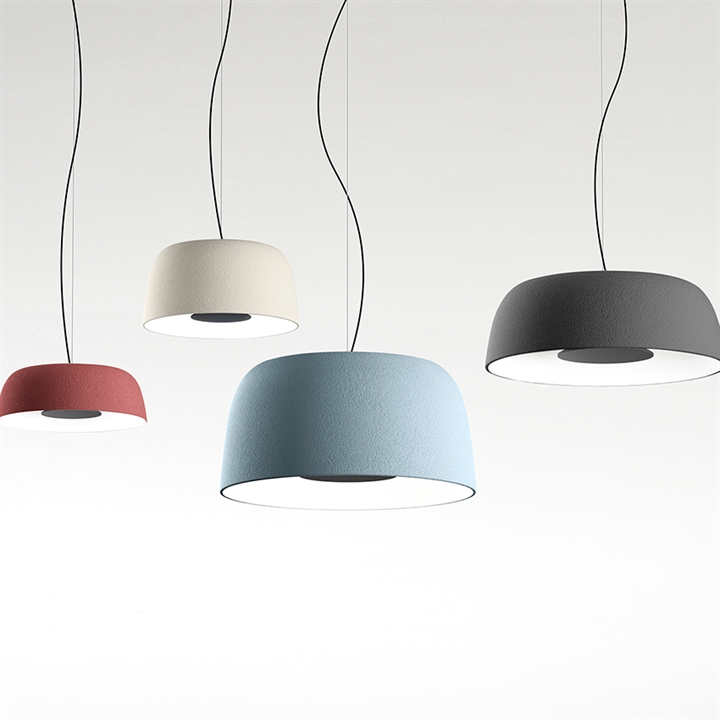De Djembe-serie bestaat uit 7 verschillende maten hanglampen en plafondlampen in 4 prachtige kleuren.