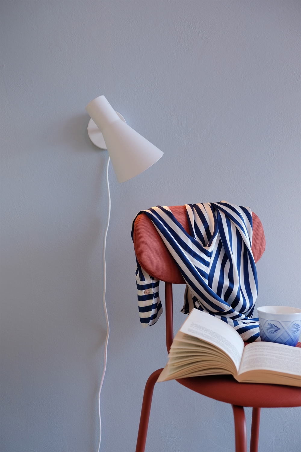 De wandlamp heeft een minimalistisch design en is perfect om naast het bed te hangen.