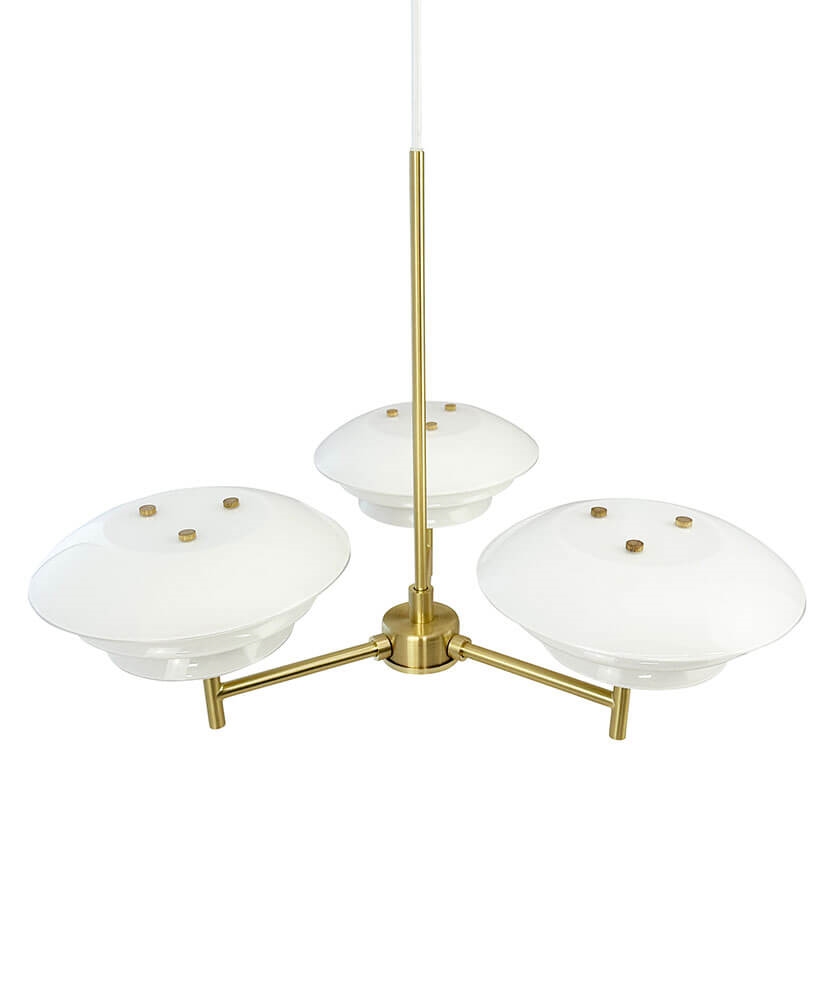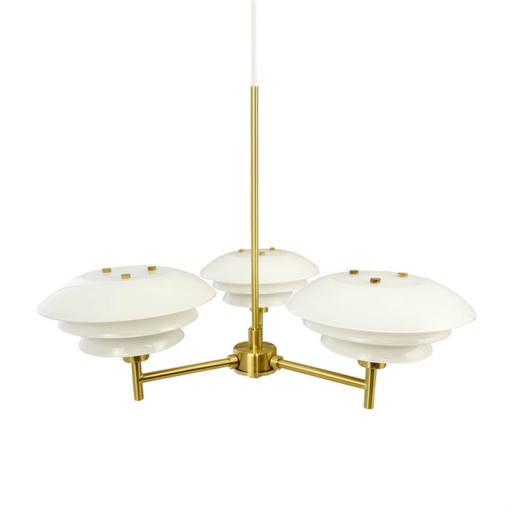 DL20 kroonluchter in opaal en messing voegt tijdloze schoonheid toe aan je interieur en is ideaal als lamp boven de eettafel, in je woonkamer of in een foyer. De kroonluchter heeft drie armen, elk met een lichtbron en drie kappen van opaalglas. Samen met het messing ontwerp geeft het opaalglas de kroonluchter een elegante uitstraling die een klassiek element aan je huis toevoegt.