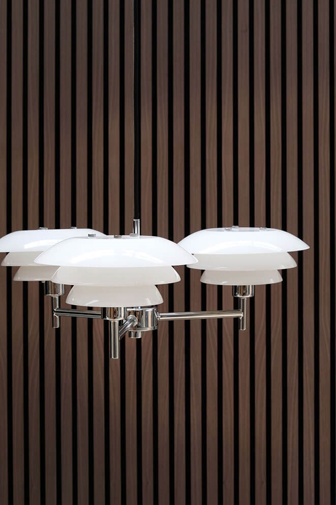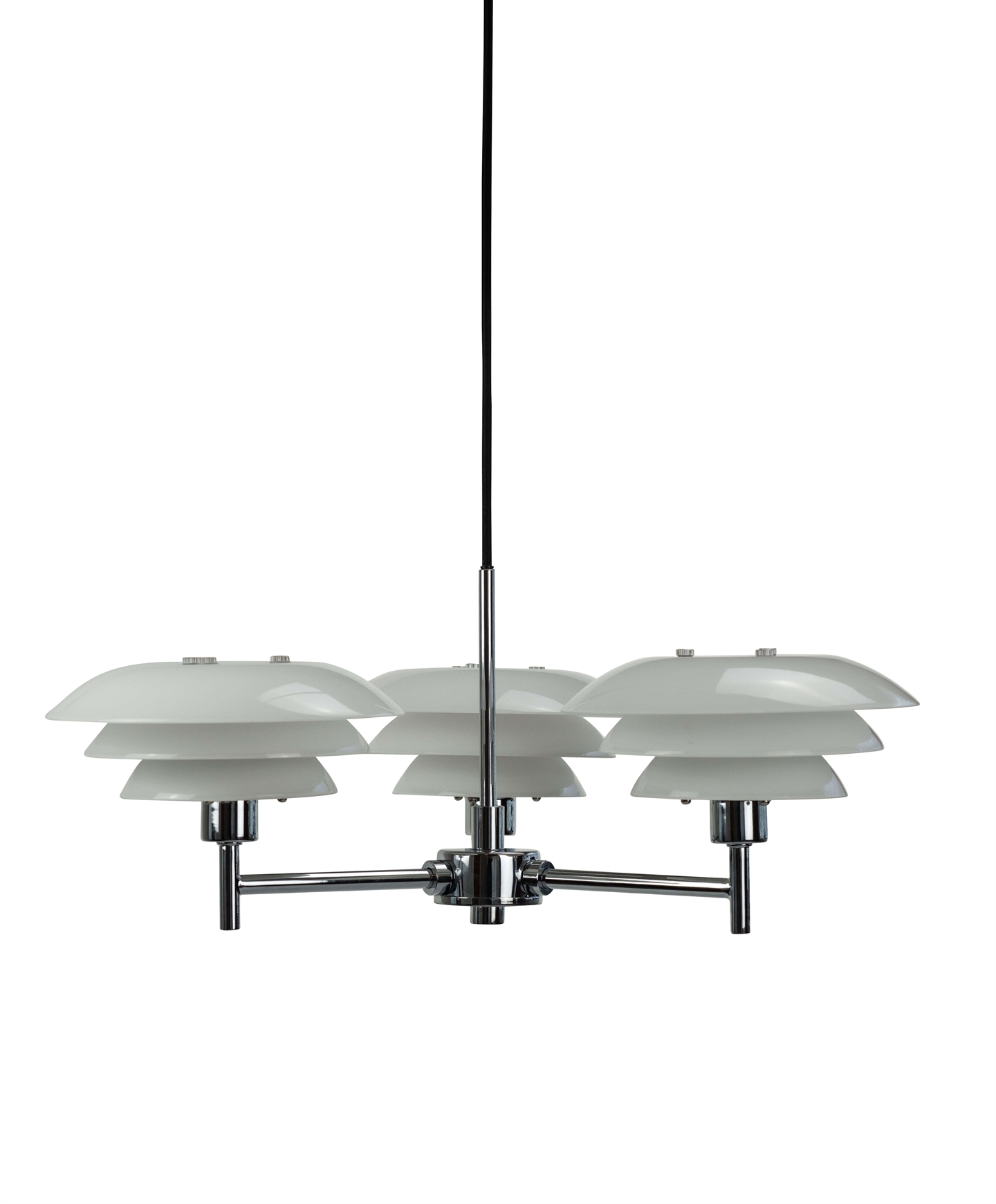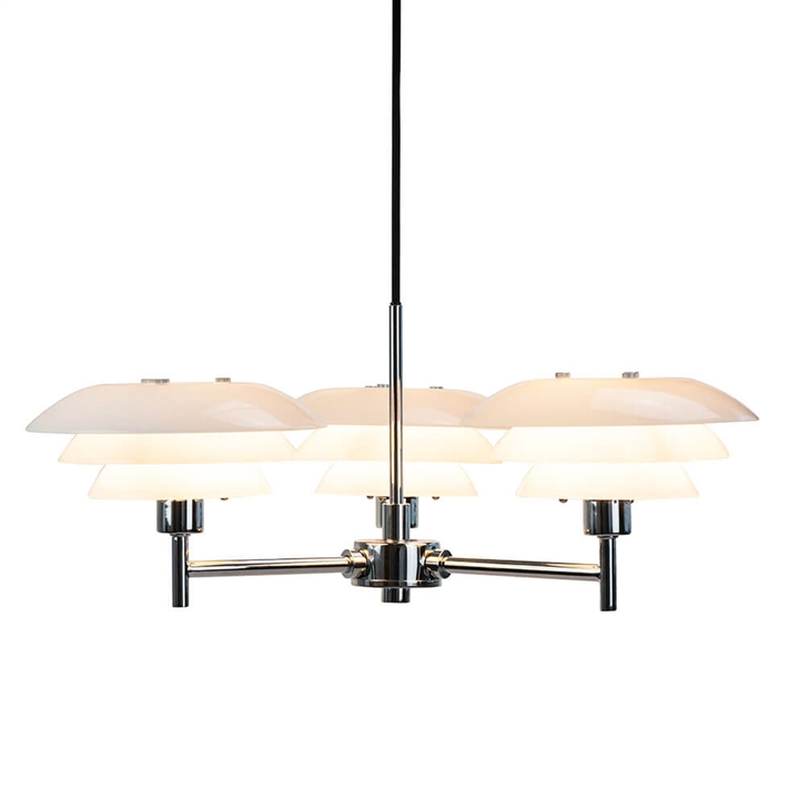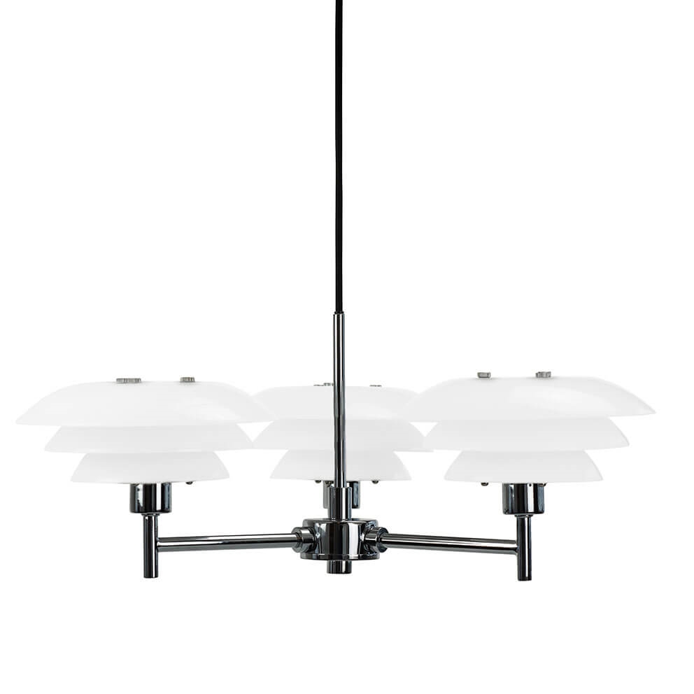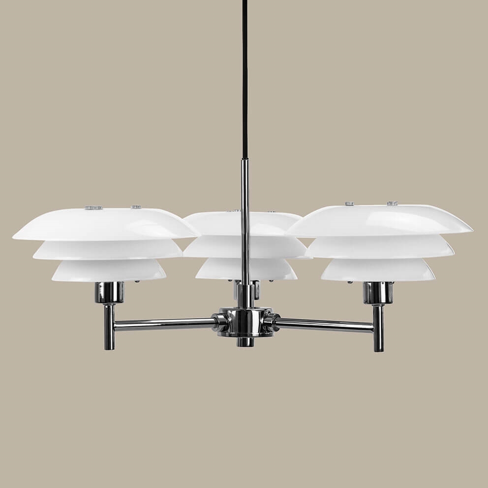DL20 kroonluchter in opaal en chroom voegt tijdloze schoonheid toe aan je interieur en is ideaal als lamp boven de eettafel, in je woonkamer of in een foyer. De kroonluchter heeft drie armen, elk met een lichtbron met drie kappen van opaalglas. Samen met het ontwerp in chroom geeft het opaalglas de kroonluchter een elegante uitstraling die een klassiek element aan je huis toevoegt.