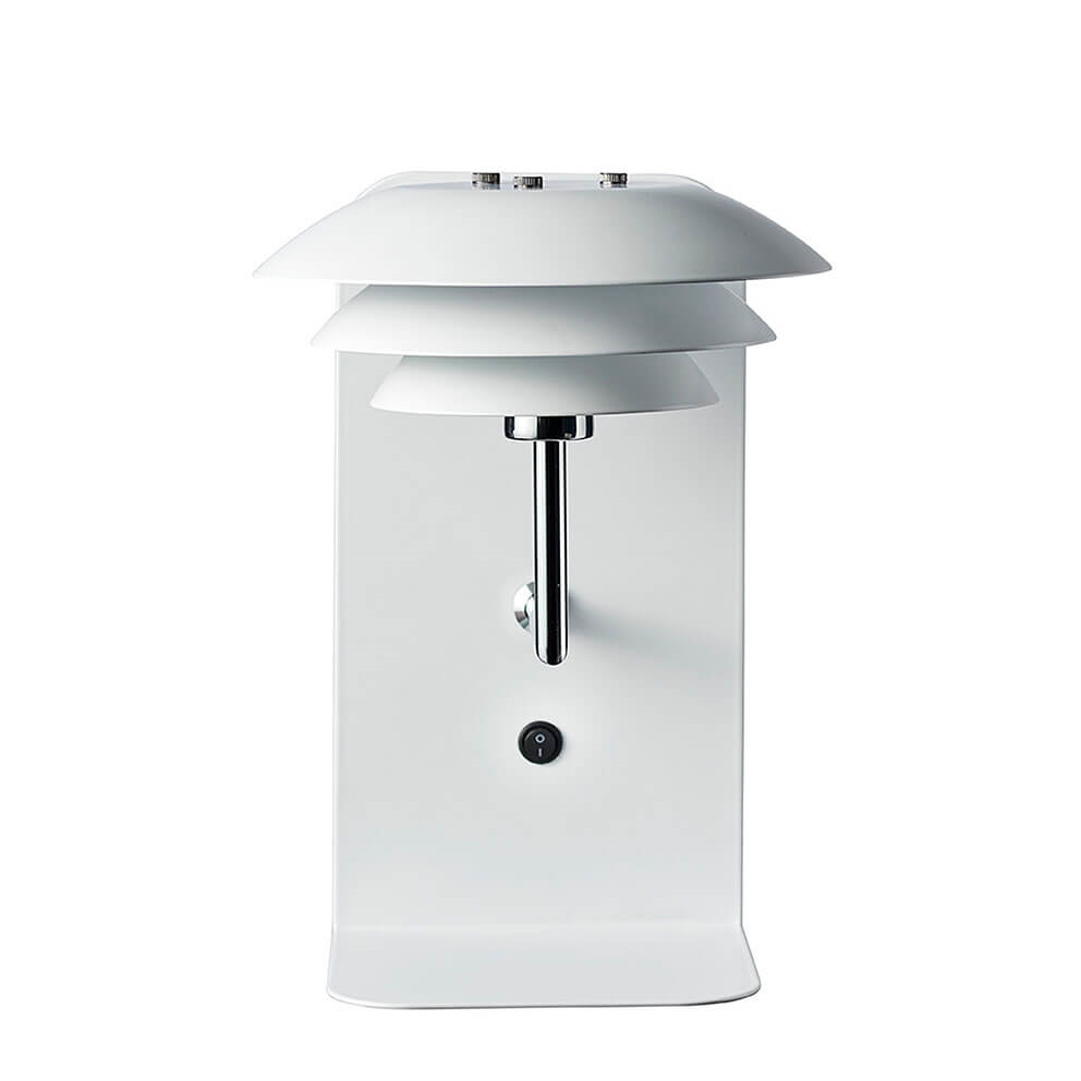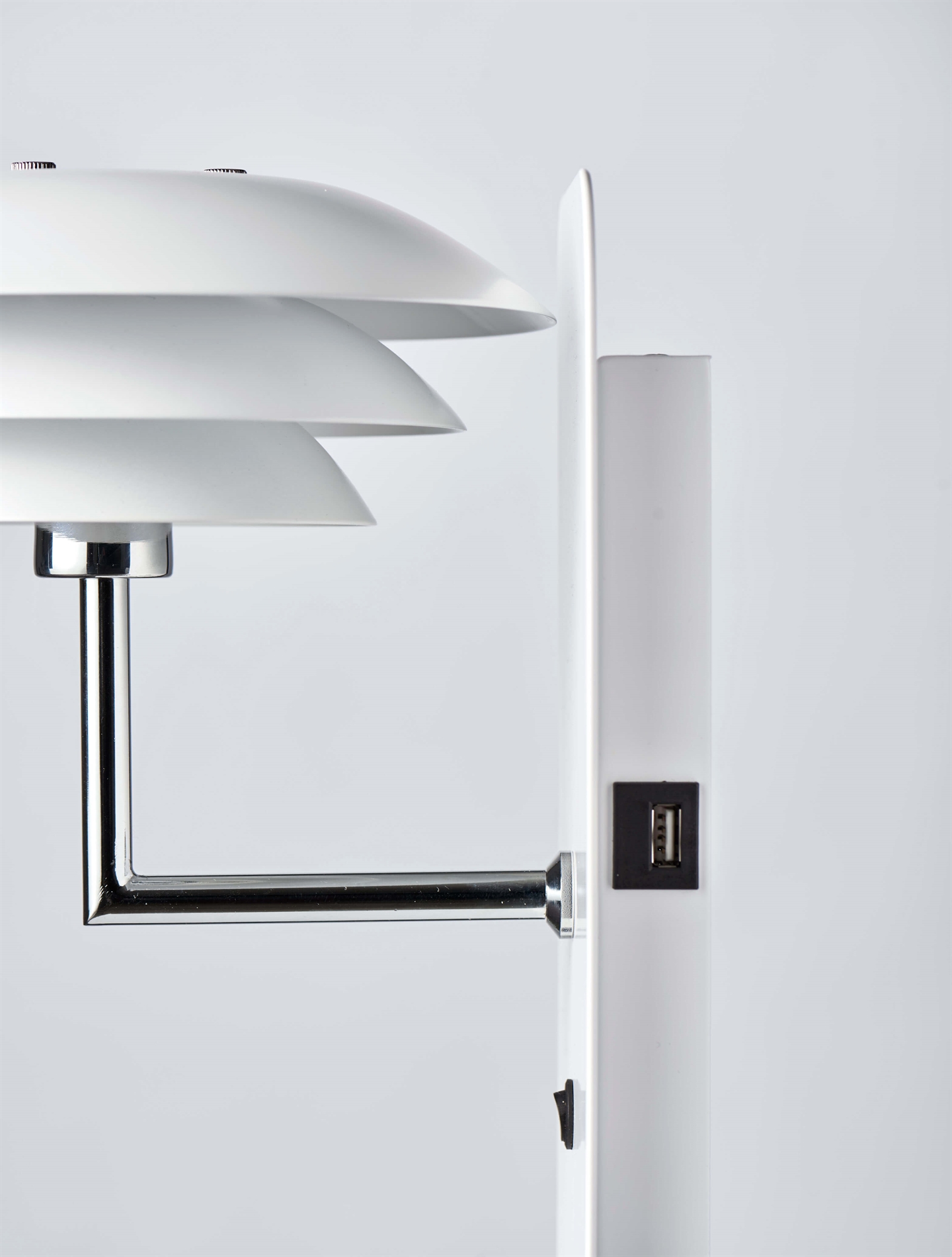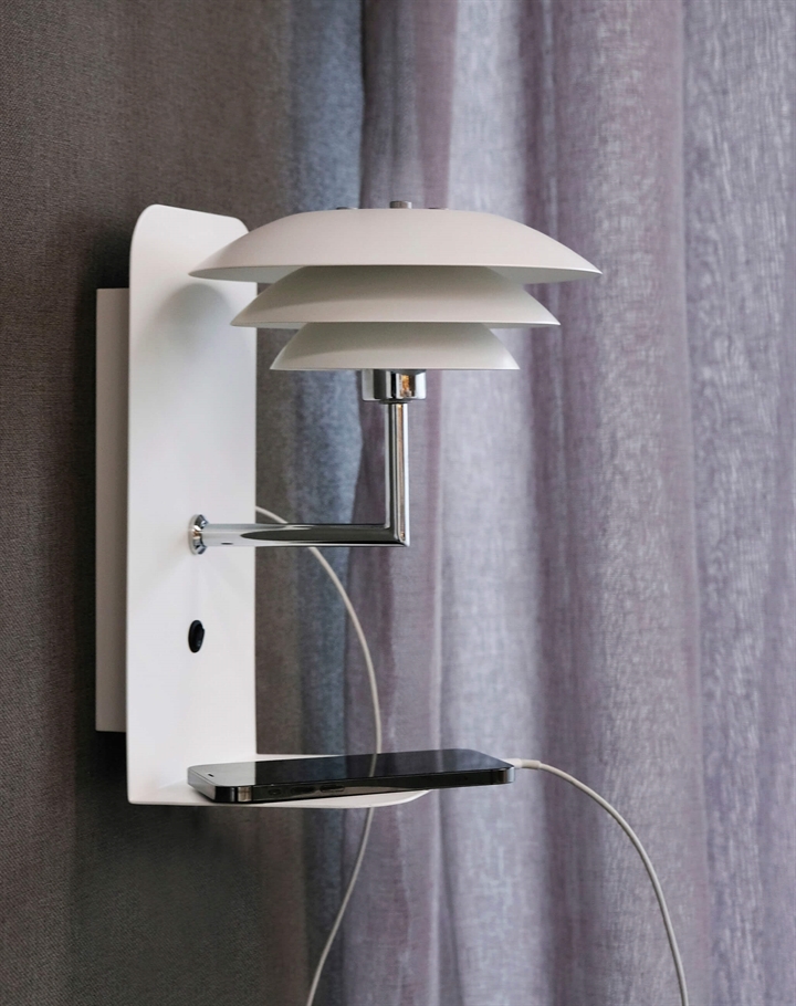 DL20 de wandlamp in wit met een klein plankje met ingebouwde USB is perfect voor het opbergen van je mobiel tijdens het opladen. Deze variant van DL20 is ideaal als zowel lamp als nachtkastje in de slaapkamer. De wandlamp heeft drie witte metalen schermen in verschillende maten, die zorgen voor een gezellige verlichting zonder te verblinden. De witte schermen geven de lamp een elegante uitstraling die bijdraagt aan de inrichting van je huis.