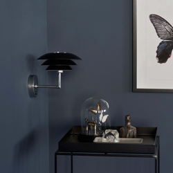 DL20 wandlamp in zwart voegt tijdloze schoonheid toe aan je interieur en is ideaal als lamp in je woonkamer, slaapkamer of hal. De wandlamp heeft drie schermen in zwart metaal in verschillende maten, die zorgen voor een gezellige verlichting zonder te verblinden. De zwarte schermen geven de lamp een elegante uitstraling die bijdraagt aan de inrichting van je huis.