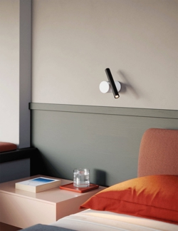 De wand- en plafondlamp Doi bestaat uit een elegante basis en een LED-spotlicht in de vorm van een schermcilinder van 18 cm. De basis en de schermcilinder zijn verbonden door een mechanisch scharnier, zodat het licht zowel naar boven als naar beneden kan worden gedraaid en gericht.