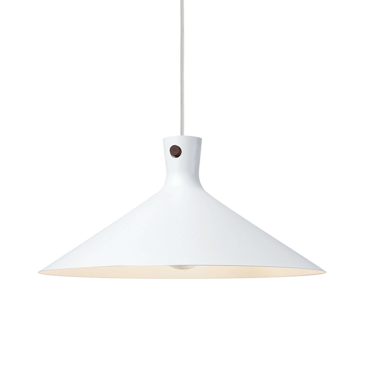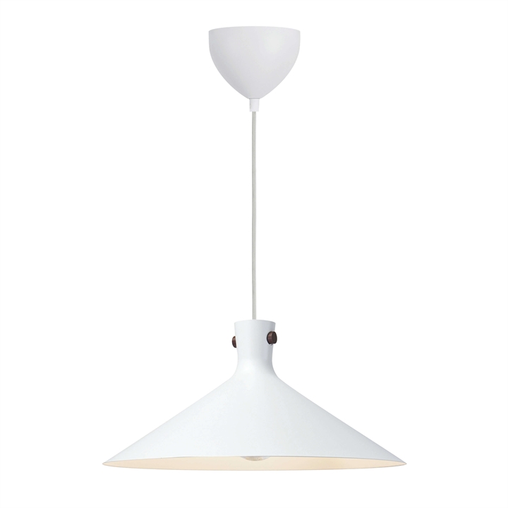 De hanglamp Dorina is vervaardigd in een elegante mix van metaal en hout. Het ontwerp is tijdloze Scandinavische minimalisme met een kegelvormige witte kap van metaal en een detail in donker gebeitst berkenhout. Dorina is een goede keuze als verlichting boven de eettafel en past goed in veel verschillende interieurs.