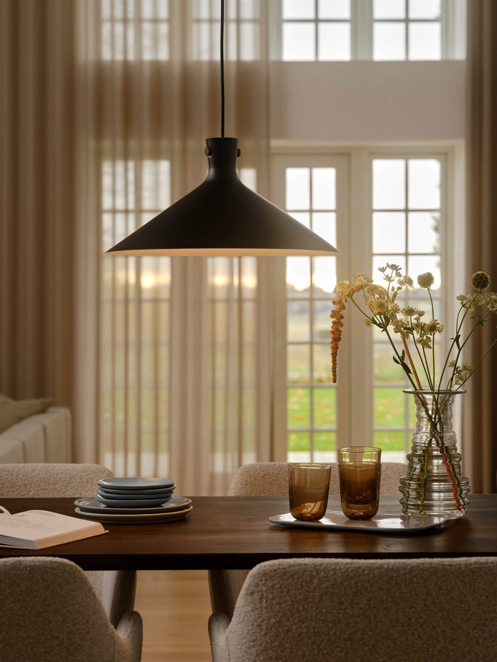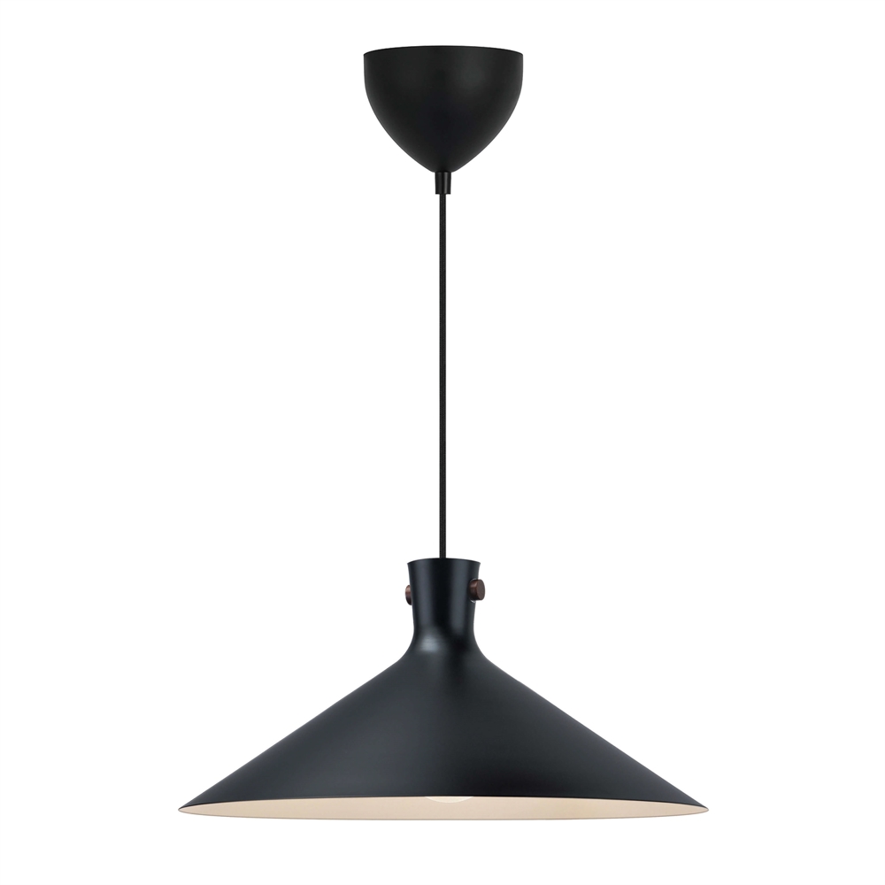 De hanglamp Dorina is vervaardigd in een elegante mix van metaal en hout. Het ontwerp is tijdloze Scandinavische minimalisme met een kegelvormige witte kap van metaal en detail in donker gebeitst berkenhout. Dorina is een goede keuze als verlichting boven de eettafel en zal goed passen in veel verschillende interieurs.