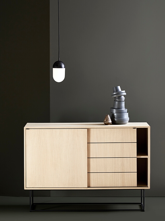 De Dot hanglamp bestaat uit een opalen glazen kap, waarbij het bovenste deel van de kap is bedekt met een geperforeerde bovenkap. De kleine gaatjes in het bovenste deel van de kap zorgen voor een zachte en rustige uitstraling, omdat slechts een deel van het licht erdoorheen kan schijnen. De hanglamp is ontworpen om een gezellige sfeer te creëren en is daarom ook ideaal om in een hoek van de woonkamer op te hangen.