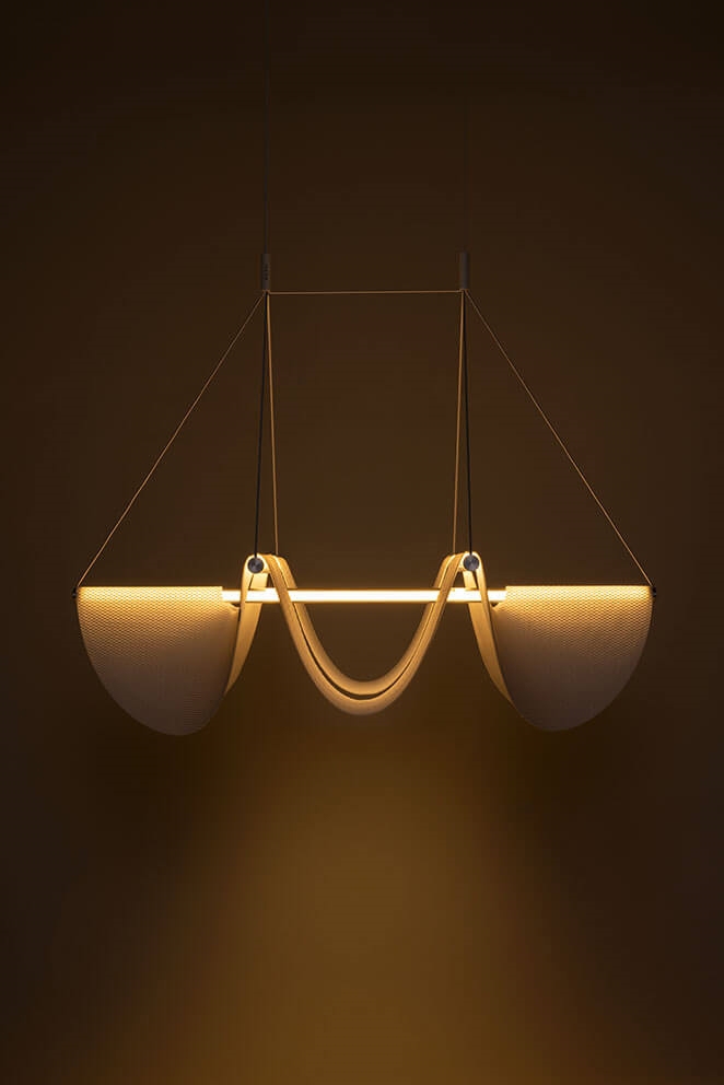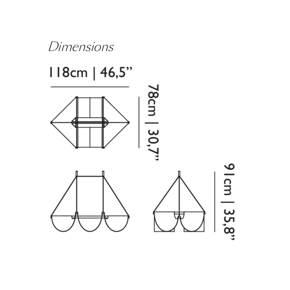 Drape Light 118 daagt de klassieke opvattingen over verlichting uit. De structuur van de lamp met drie LED-buizen biedt een stabiel frame, terwijl de gedrapeerde organische polyesterscherm door middel van zwaartekracht een fantastische visuele effect creëert in de interactie tussen licht en schaduw.
