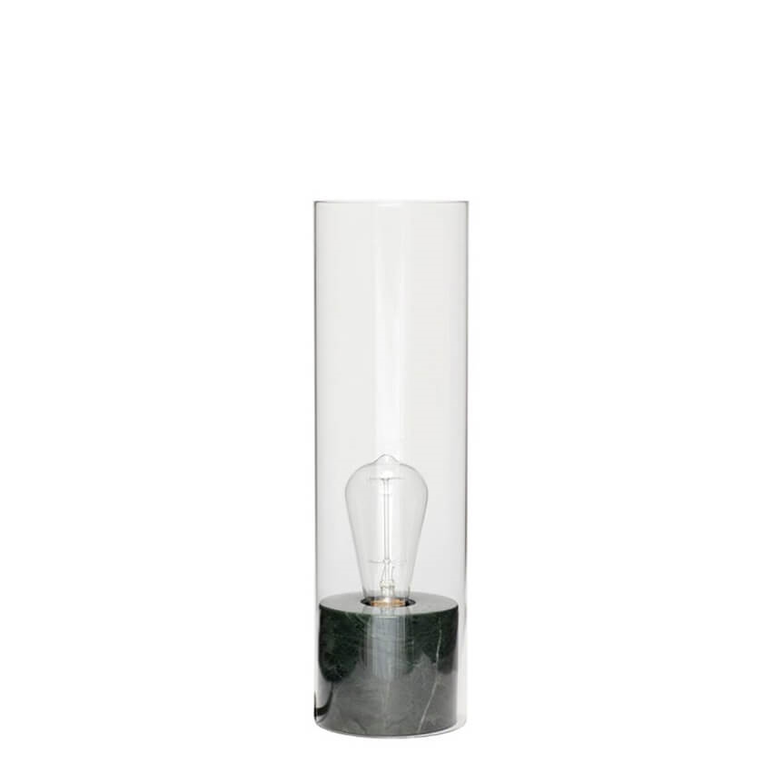 Deze unieke tafellamp met zijn langwerpige cilindervorm, die prachtig groen marmer en glas combineert, creëert een moderne uitstraling.
