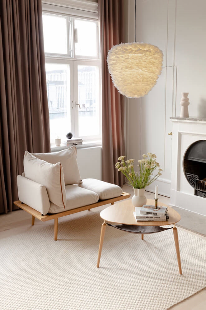 Deze verenlamp is verkrijgbaar in verschillende vormen, maten en kleuren en als plafond- of wandlamp. De lampenkap moet worden gecombineerd met een ophanging of een standaard, die apart wordt verkocht. Kies bijvoorbeeld E27-ophangingen Cannonball, Cannonball Cluster 2, Cord Set, Cord Set Pro of Rosette van Umage voor Eos Evia large. De wandophangingen Willow single en double, Tripod vloer- of tafelstandaards of Santé vloer- of tafelstandaards passen ook perfect bij Eos Evia large.