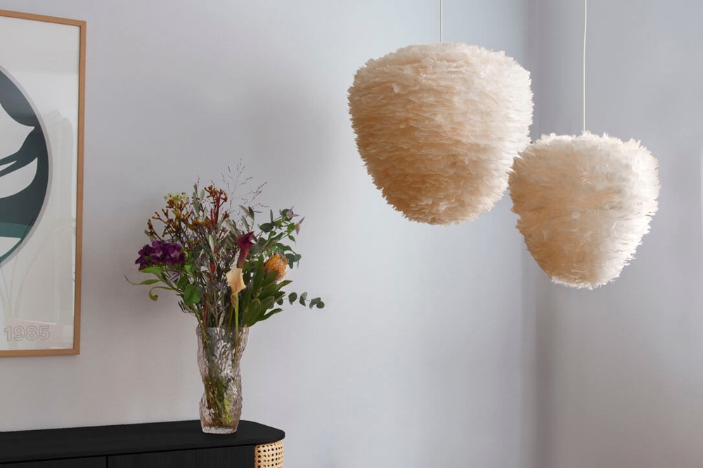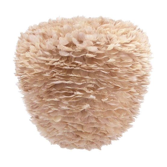 Eos Evia medium is een lampenkap in de vorm van een bijenkorf en is gemaakt van natuurlijke ganzendons. De kap heeft een elegant uiterlijk dat doet denken aan luchtige wolken aan de hemel en zal met zijn zachte veren een verfijnd element zijn in elke ruimte. Gebruik de kap bijvoorbeeld als hanglamp boven de eettafel, in de hal of als een mooie vloerlamp of tafellamp alleen of meerdere samen in de woonkamer.