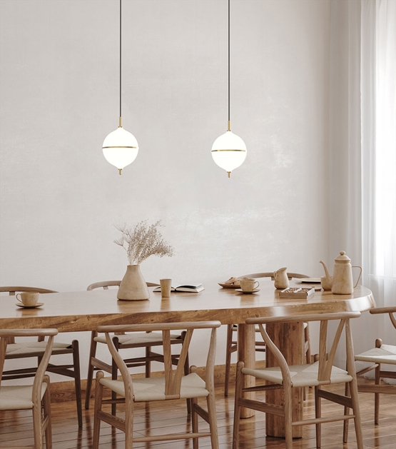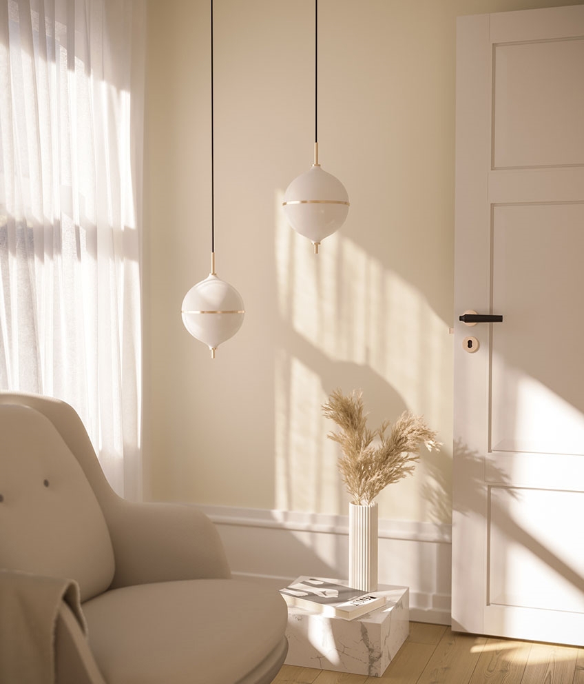 Het ontwerp is handgemaakt in messing en opaalglas en is een tijdloze combinatie van Scandinavisch minimalisme en moderne elegantie. De zwarte stoffen snoer van deze variant voegt een opvallend contrast toe aan de lichte uitstraling van de hanglamp. Een uitstekende keuze voor kleinere ruimtes of als verlichting in een cluster boven de eettafel.