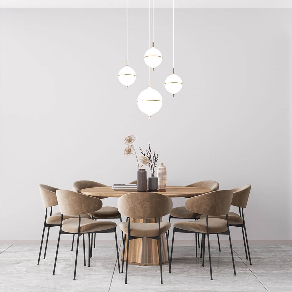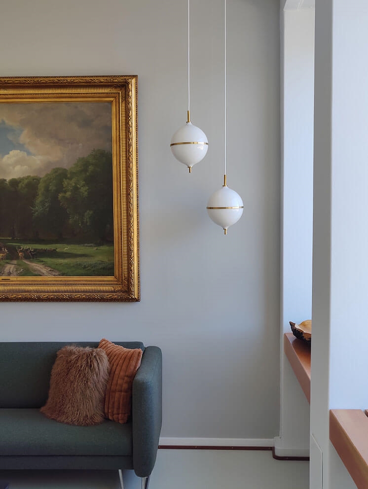 Het ontwerp is handgemaakt van messing en opaalglas en is een tijdloze combinatie van Scandinavisch minimalisme en moderne elegantie. De witte stoffen kabel van deze variant benadrukt de lichte en harmonieuze uitstraling van de hanglamp. Een uitstekende keuze voor kleinere ruimtes of als verlichting in een cluster boven de eettafel.