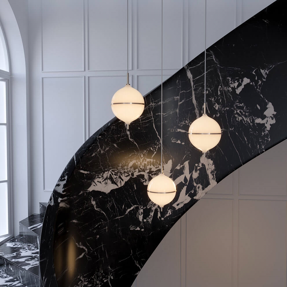 De hanglamp Eternal Moonlight is geïnspireerd door de mystiek van de maan en voegt een verfijnde touch toe aan het interieur. De bolvormige kap van mondgeblazen opaalglas verspreidt een zacht licht en wordt gescheiden door een subtiele messing band, die de halve maan symboliseert.