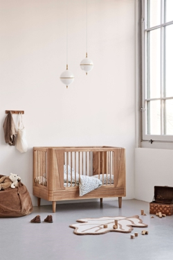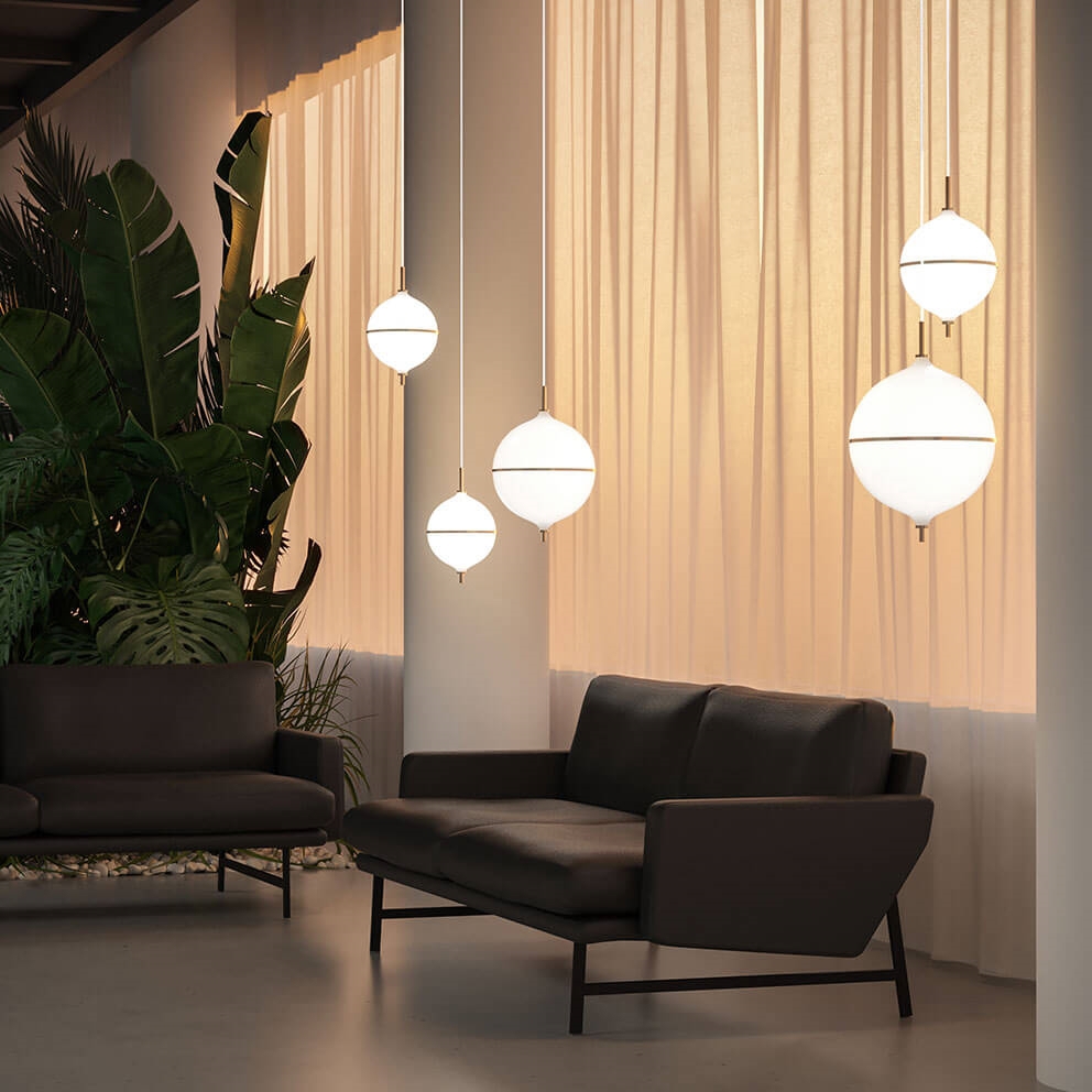 De hanglamp is verkrijgbaar in twee maten met een witte of zwarte kabel. Er zijn ook wandlampen in de lampenserie.