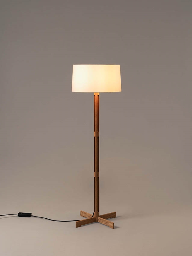 De Fad Fija vloerlamp heeft een stevige eikenhouten structuur, cilindervormig, een doorsnede en een witte linnen kap.
