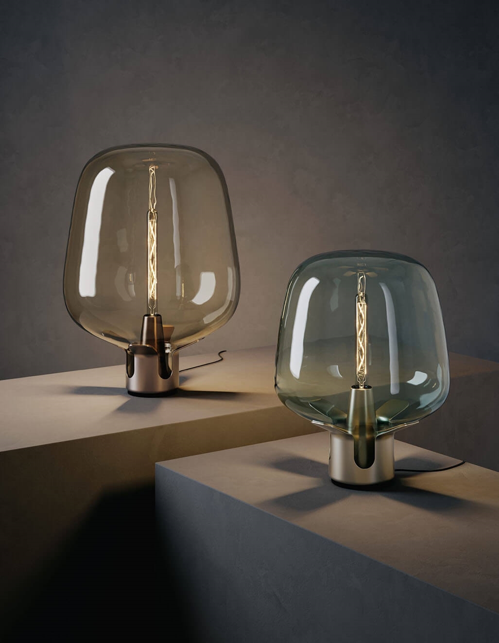 Flar is verkrijgbaar in twee maten, medium en large, met een hoogte van respectievelijk 47 cm en 62,5 cm. De basis is afgewerkt in de kleuren terra of pearl, terwijl de glazen kap honingkleurig of turkoois is.
